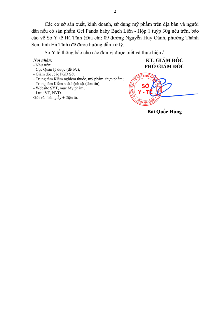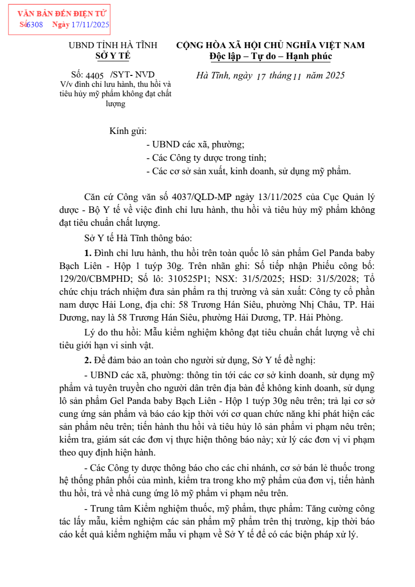 4405/SYT-NVD V/v đình chỉ lưu hành, thu hồi và tiêu hủy mỹ phẩm không đạt chất lượngẨn danh17/11/2025A -A+Ẩn danh17/11/2025A -A+ File đính kèmđình chỉ, thu hồi mỹ phẩm Gel Panda baby.pdf
