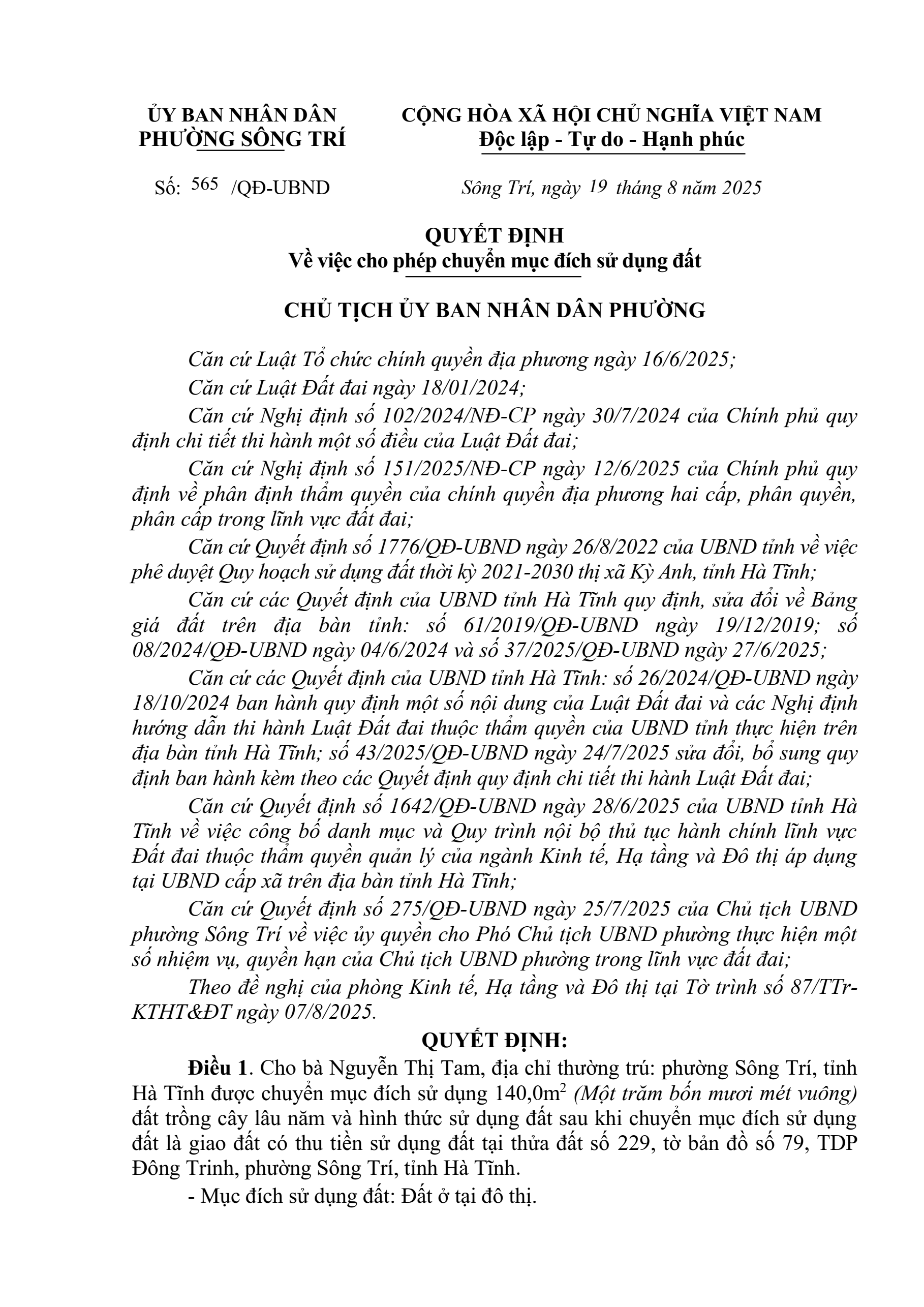 565/QĐ-UBND Quyết định về việc cho phép chuyển mục đích sử dụng đấtẨn danh18/09/2025A -A+Ẩn danh18/09/2025A -A+565/QĐ-UBND Quyết định về việc cho phép chuyển mục đích sử dụng đất