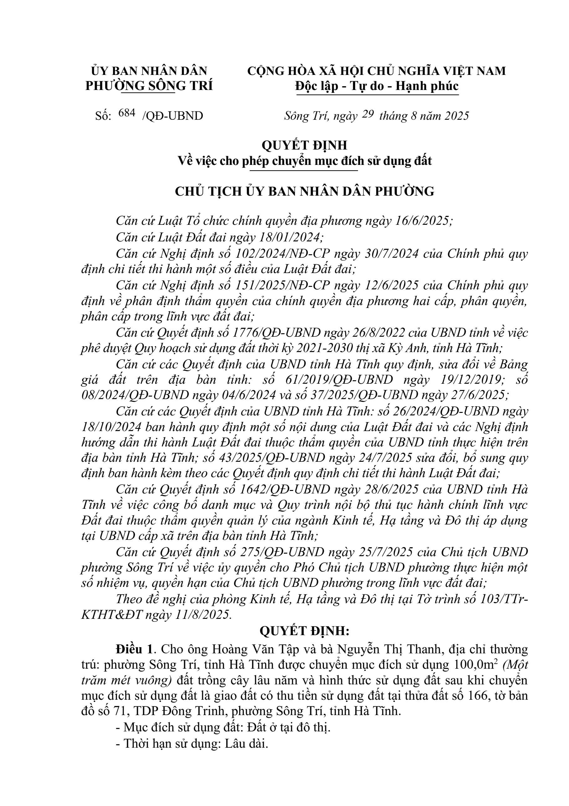 684/QĐ-UBND Quyết định về việc cho phép chuyển mục đích sử dụng đấtẨn danh18/09/2025A -A+Ẩn danh18/09/2025A -A+684/QĐ-UBND Quyết định về việc cho phép chuyển mục đích sử dụng đất