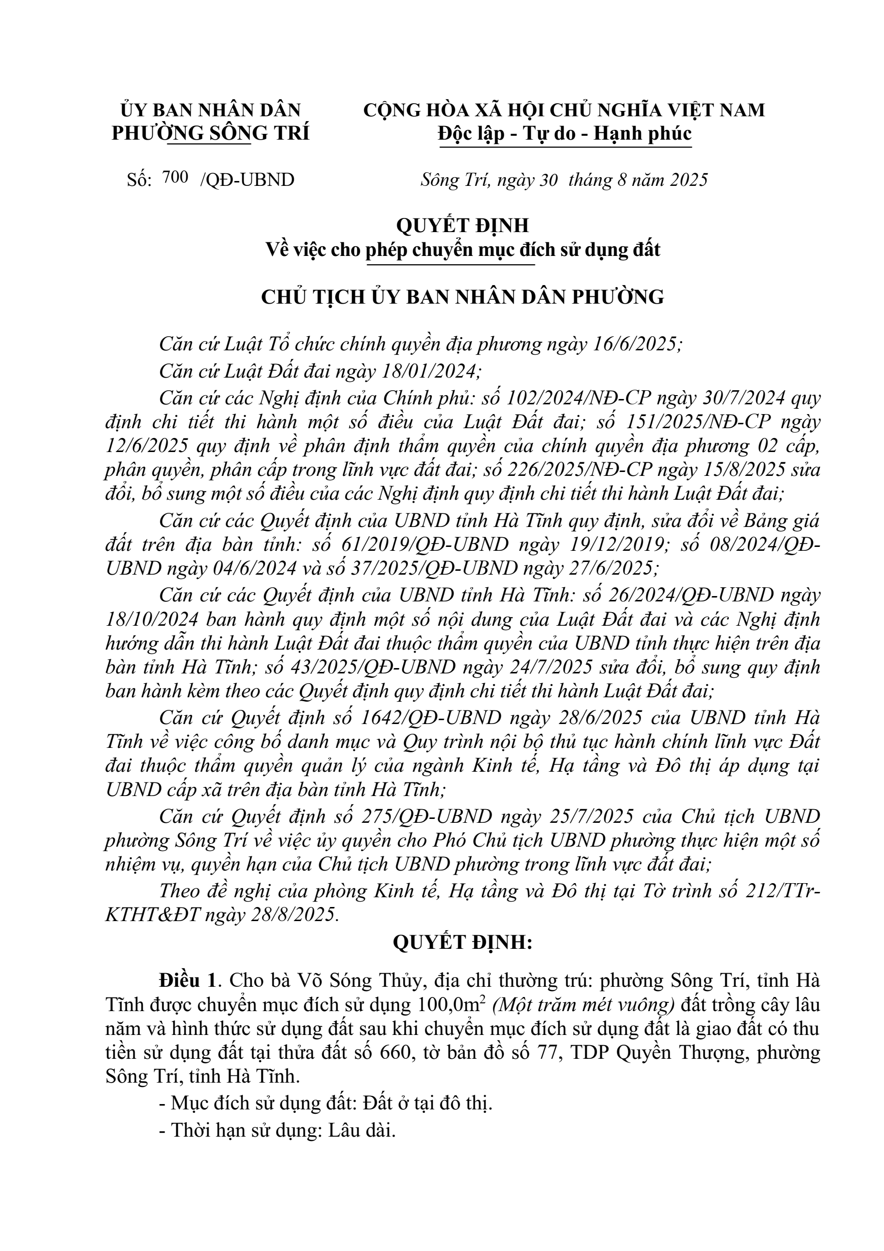 700/QĐ-UBND Quyết định về việc cho phép chuyển mục đích sử dụng đấtẨn danh18/09/2025A -A+Ẩn danh18/09/2025A -A+700/QĐ-UBND Quyết định về việc cho phép chuyển mục đích sử dụng đất