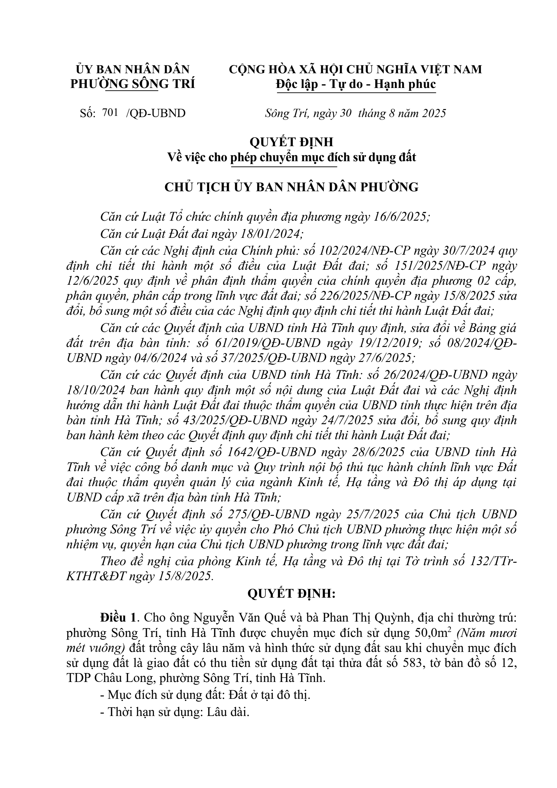 701/QĐ-UBND Quyết định về việc cho phép chuyển mục đích sử dụng đấtẨn danh18/09/2025A -A+Ẩn danh18/09/2025A -A+701/QĐ-UBND Quyết định về việc cho phép chuyển mục đích sử dụng đất