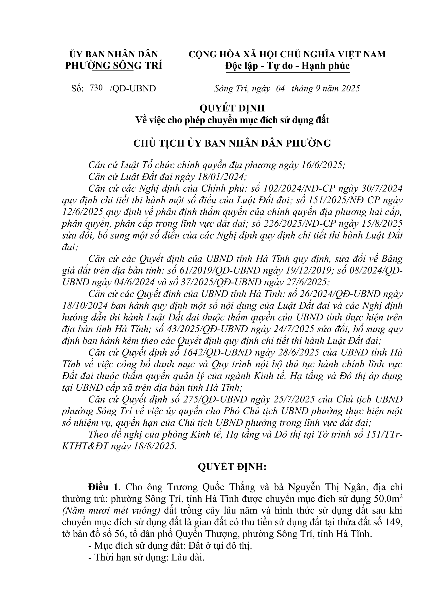 730/QĐ-UBND Quyết định về việc cho phép chuyển mục đích sử dụng đấtẨn danh18/09/2025A -A+Ẩn danh18/09/2025A -A+730/QĐ-UBND Quyết định về việc cho phép chuyển mục đích sử dụng đất