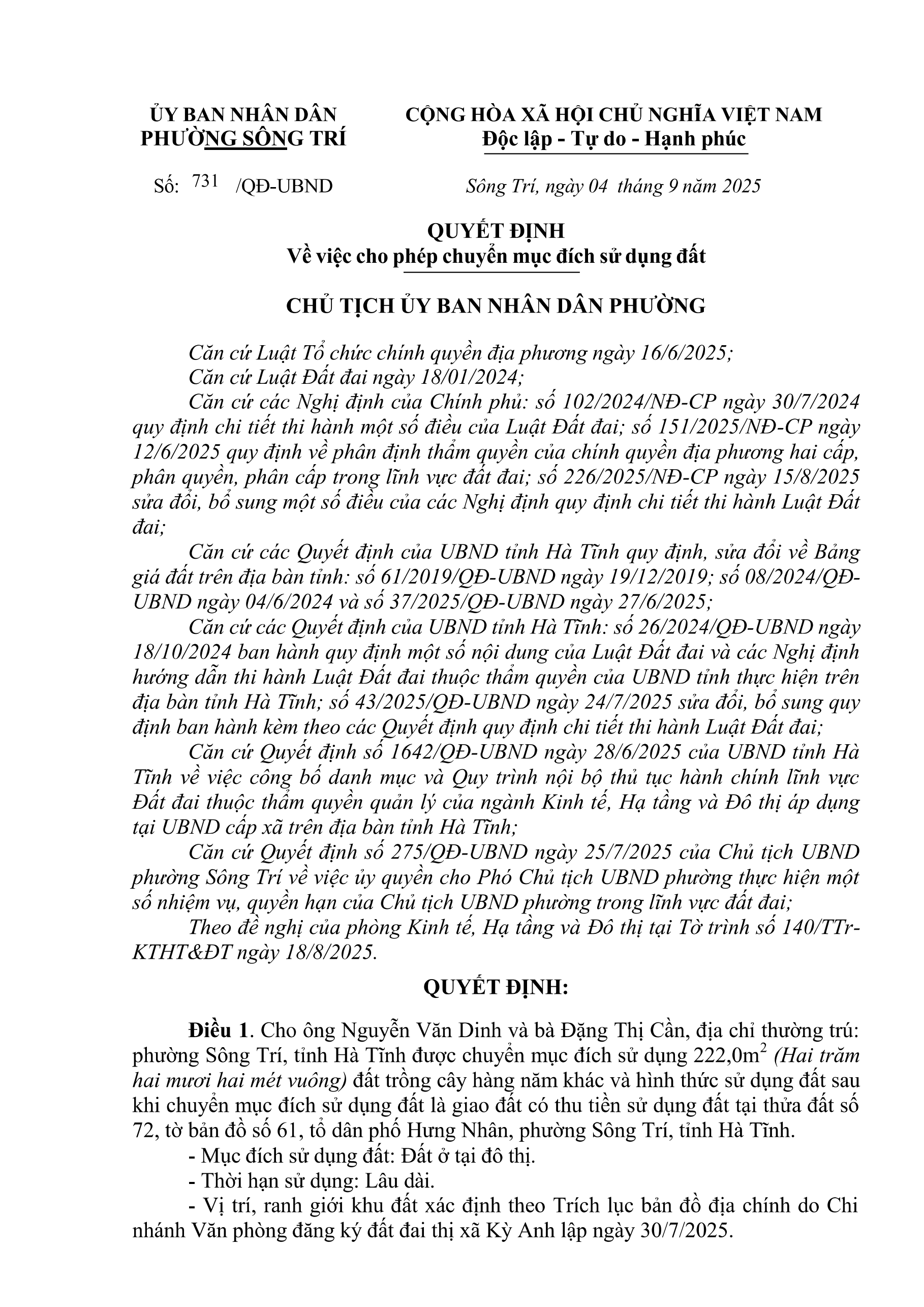 731/QĐ-UBND Quyết định về việc cho phép chuyển mục đích sử dụng đấtẨn danh18/09/2025A -A+Ẩn danh18/09/2025A -A+731/QĐ-UBND Quyết định về việc cho phép chuyển mục đích sử dụng đất