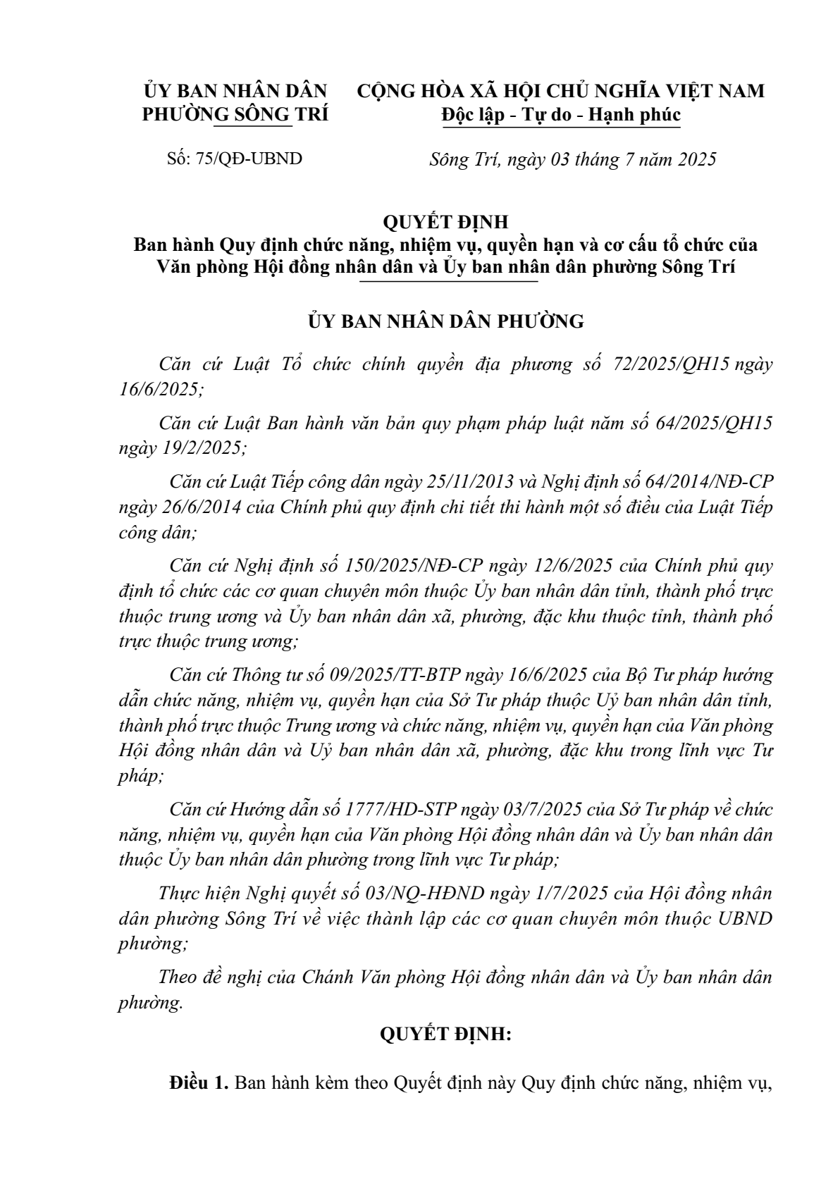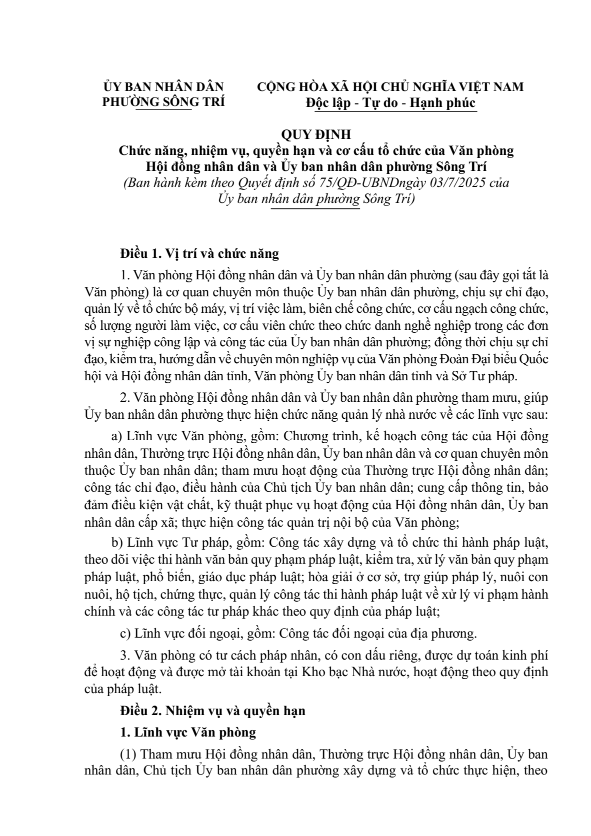 75/QĐ-UBND Ban hành Quy định chức năng, nhiệm vụ, quyền hạn và cơ cấu tổ chức của Văn phòng Hội đồng nhân dân và Ủy ban nhân dân phường Sông TríẨn danh10/07/2025A -A+Ẩn danh10/07/2025A -A+ File đính kèmVăn phòng UBND phường.pdf