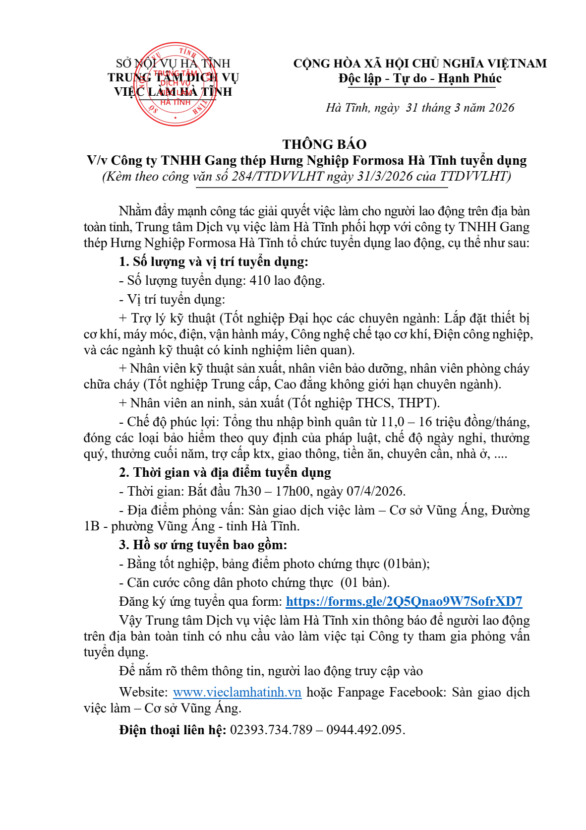 Công ty TNHH Gang thép Hưng Nghiệp Formosa Hà Tĩnh thông báo tuyển dụngẨn danh01/04/2026A -A+Ẩn danh01/04/2026A -A+File đính kèmThong-bao-tuyen-dung-07.4-kem-theo(31.03.2026_16h01p25)_signed.pdf
