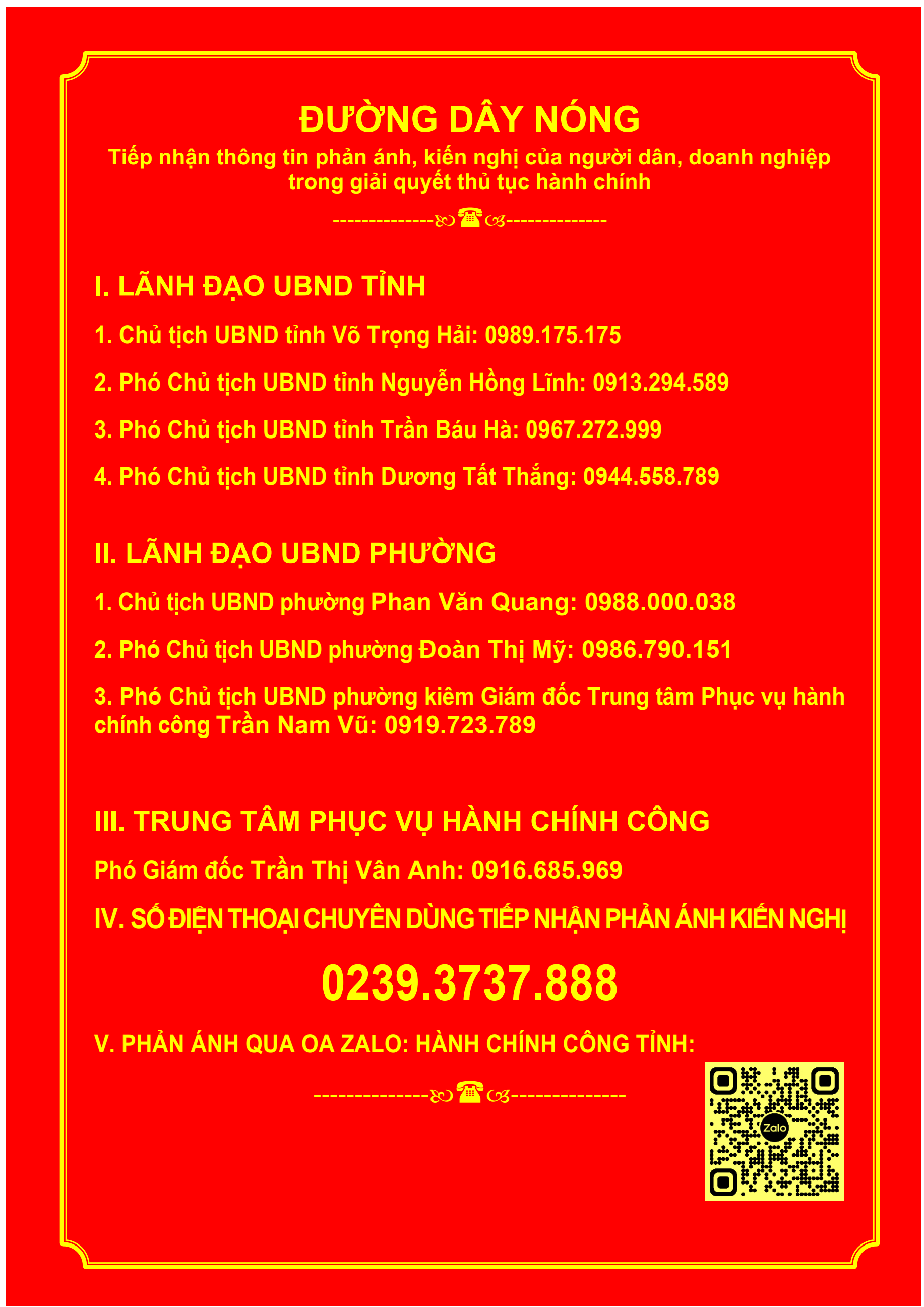 Đường Dây NóngẨn danh17/09/2025A -A+Ẩn danh17/09/2025A -A+Đường dây nóng Tiếp nhận thông tin phản ánh, kiến nghị của người dân, doanh nghiệp trong giải quyết thủ tục hành chính