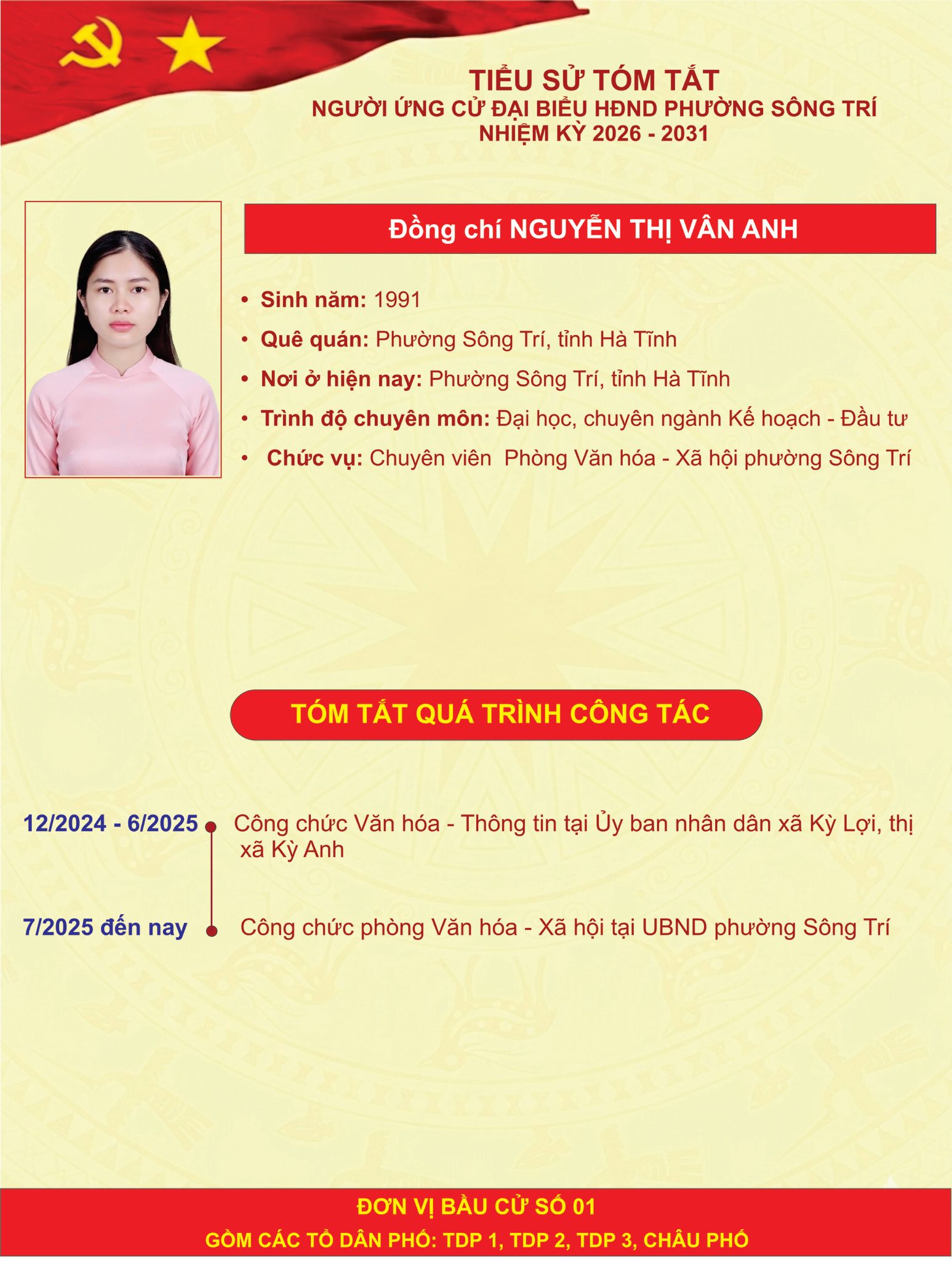 1. Đồng chí Nguyễn Thị Vân Anh- Chuyên viên phòng Văn hóa - Xã hội tại UBND phường Sông Trí