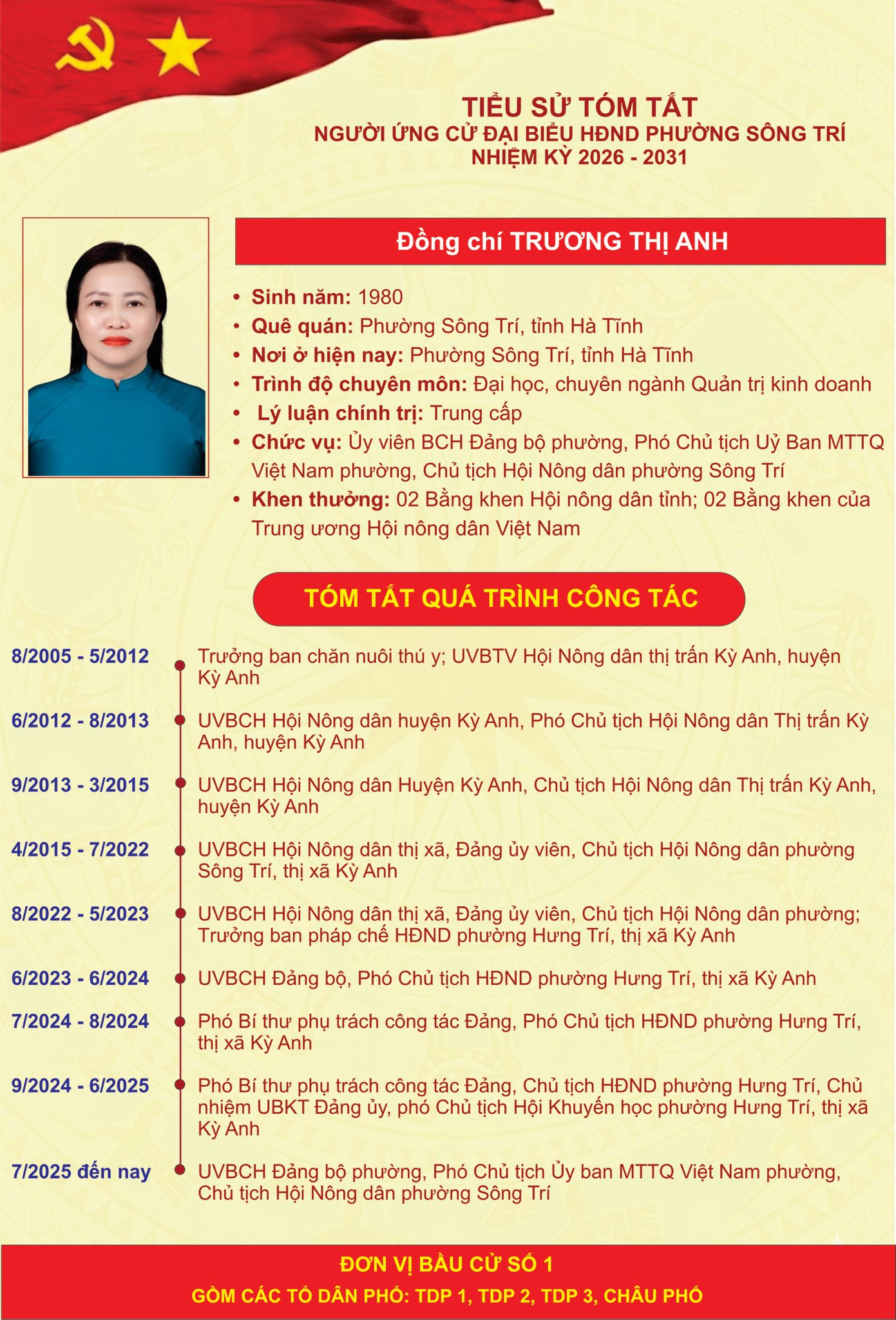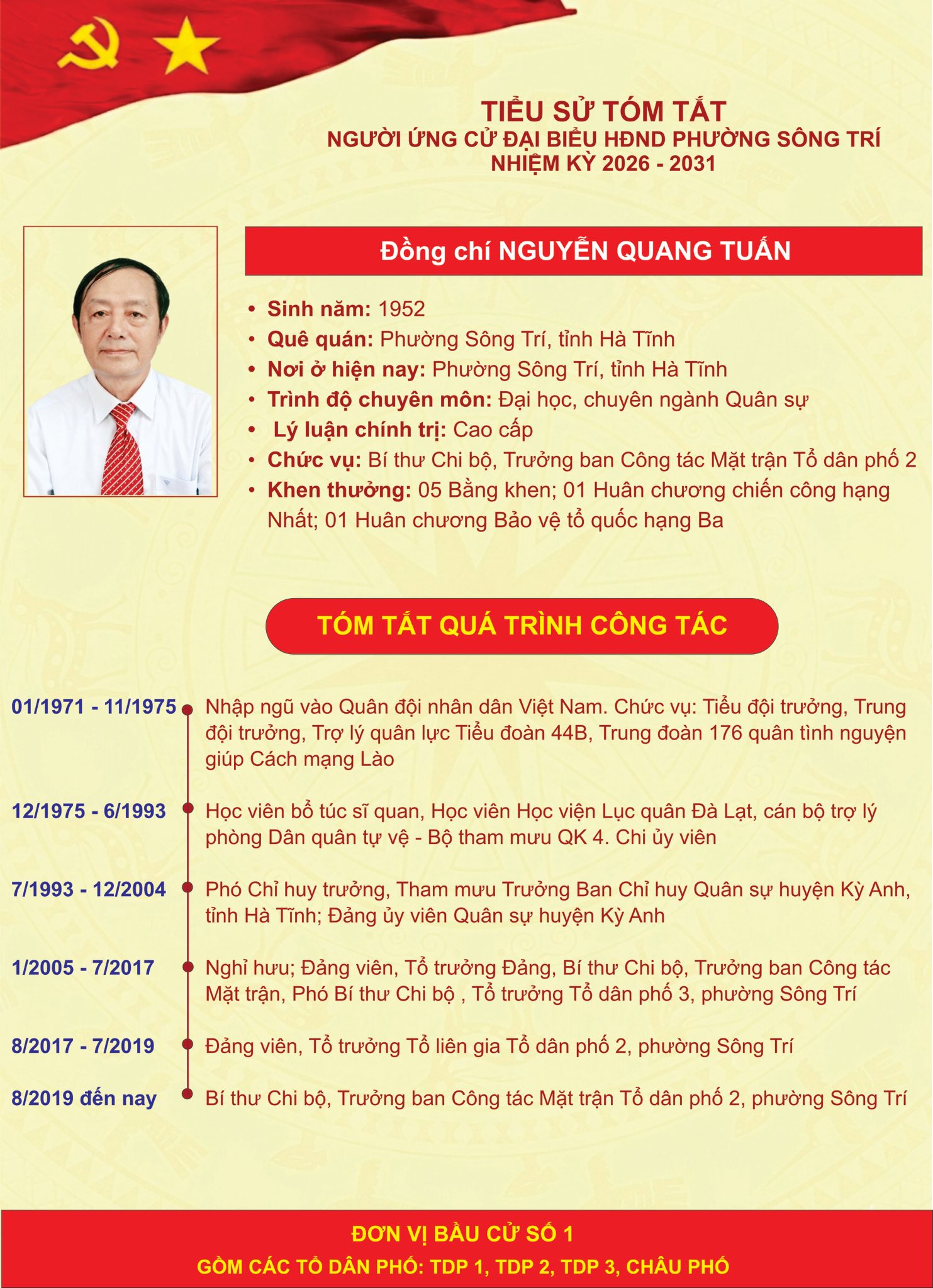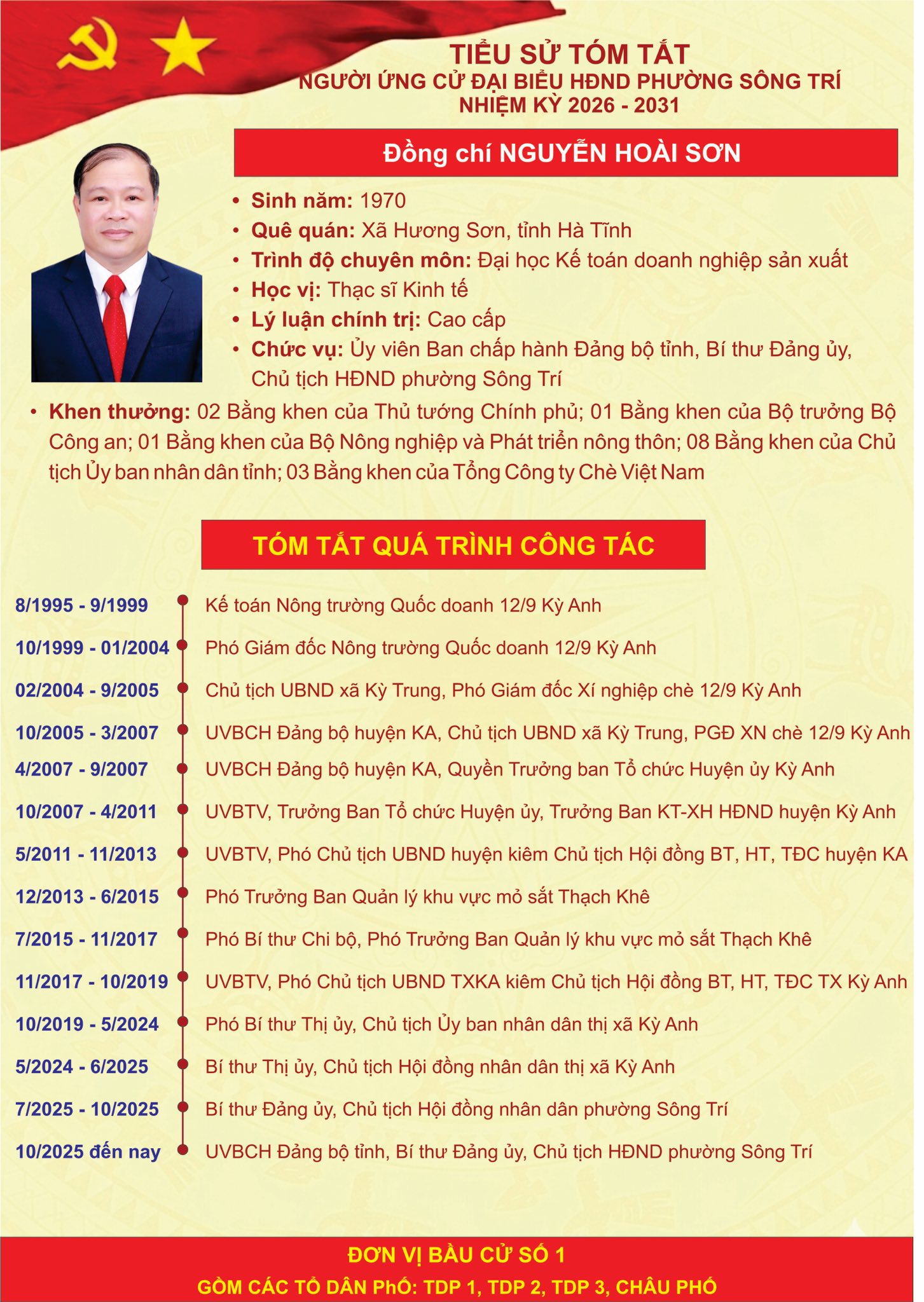 Giới thiệu thông tin của các đồng chí ứng cử đại biểu HĐND phường Sông Trí, nhiệm kỳ 2026 - 2031, tại Đơn vị bầu cử số 01 (các tổ dân phố: TDP 1, TDP 2, TDP 3, Châu Phố):
