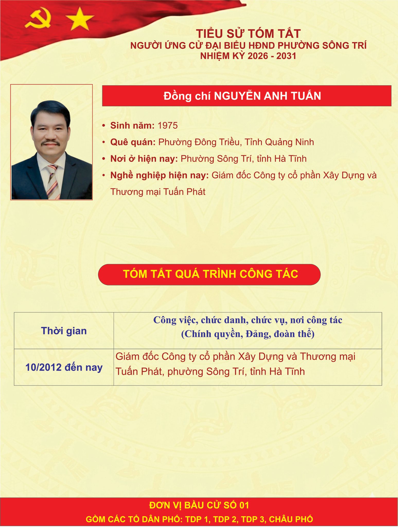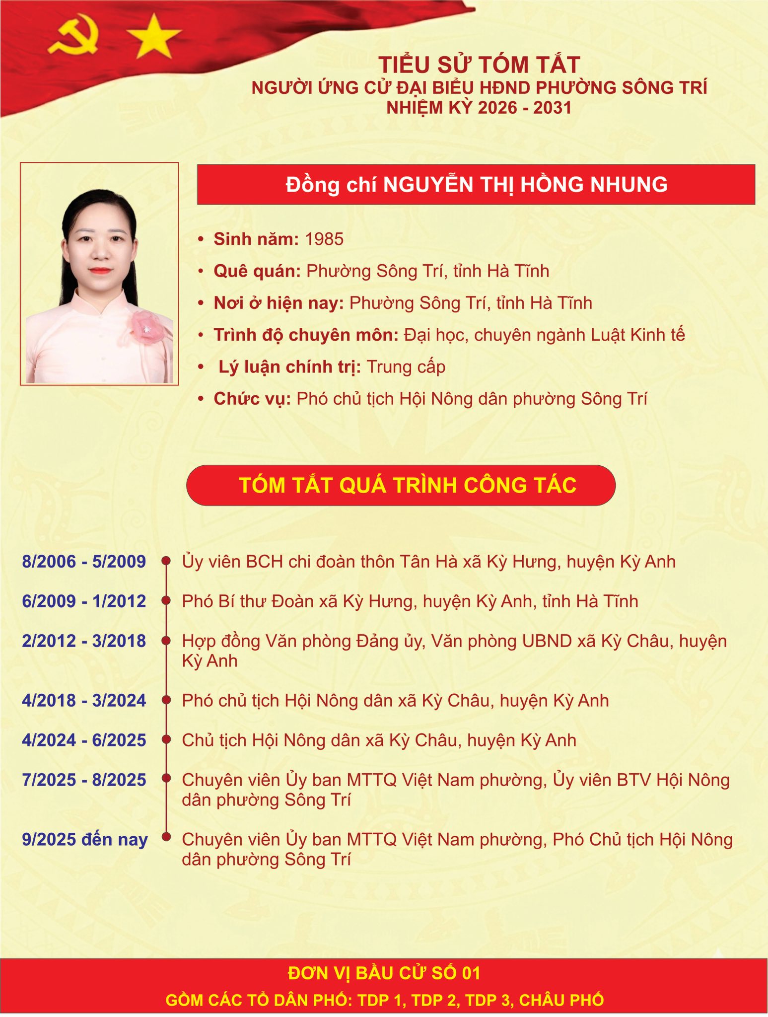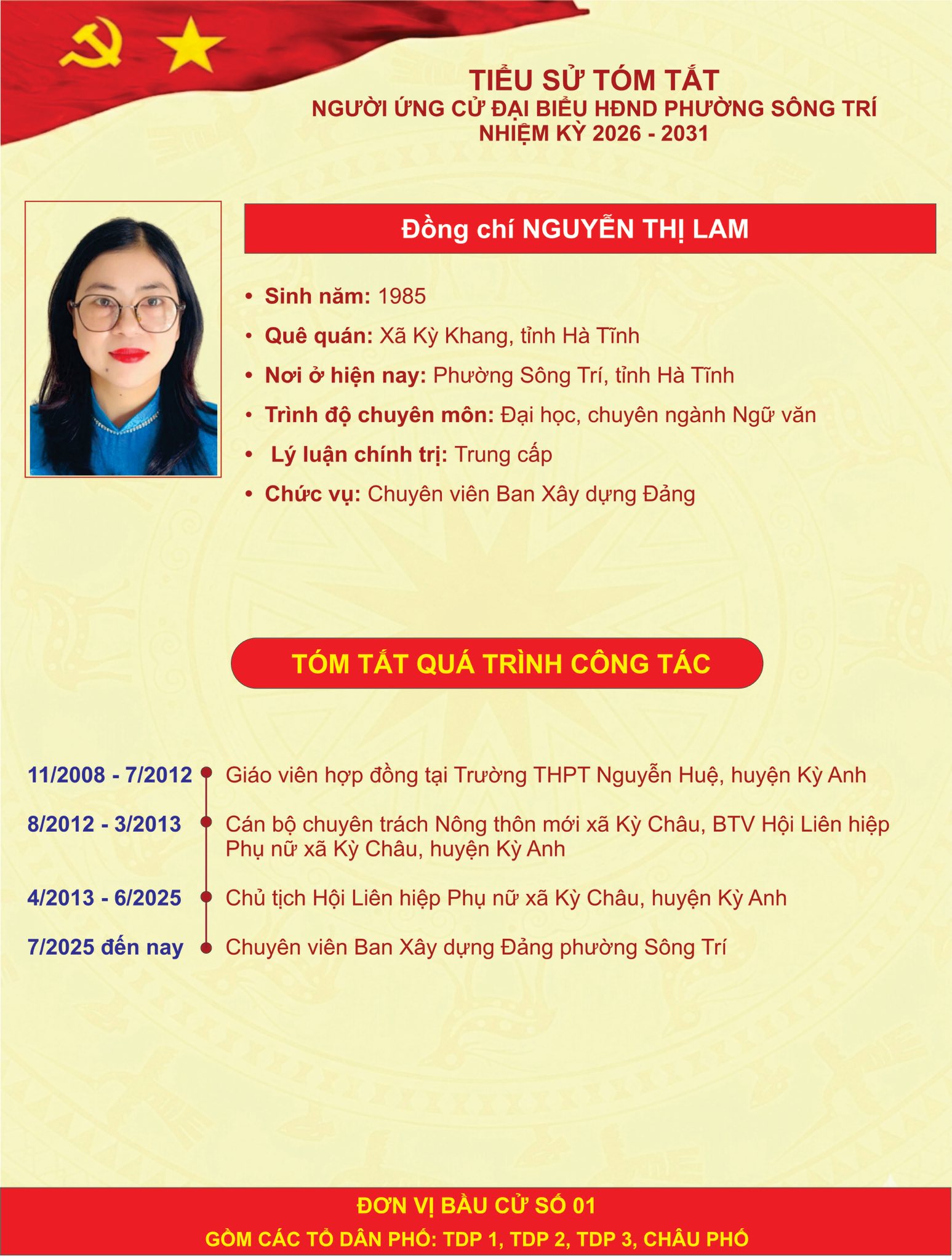 Giới thiệu thông tin của các đồng chí ứng cử đại biểu HĐND phường Sông Trí, nhiệm kỳ 2026 - 2031, tại Đơn vị bầu cử số 01 (các tổ dân phố: TDP 1, TDP 2, TDP 3, Châu Phố):