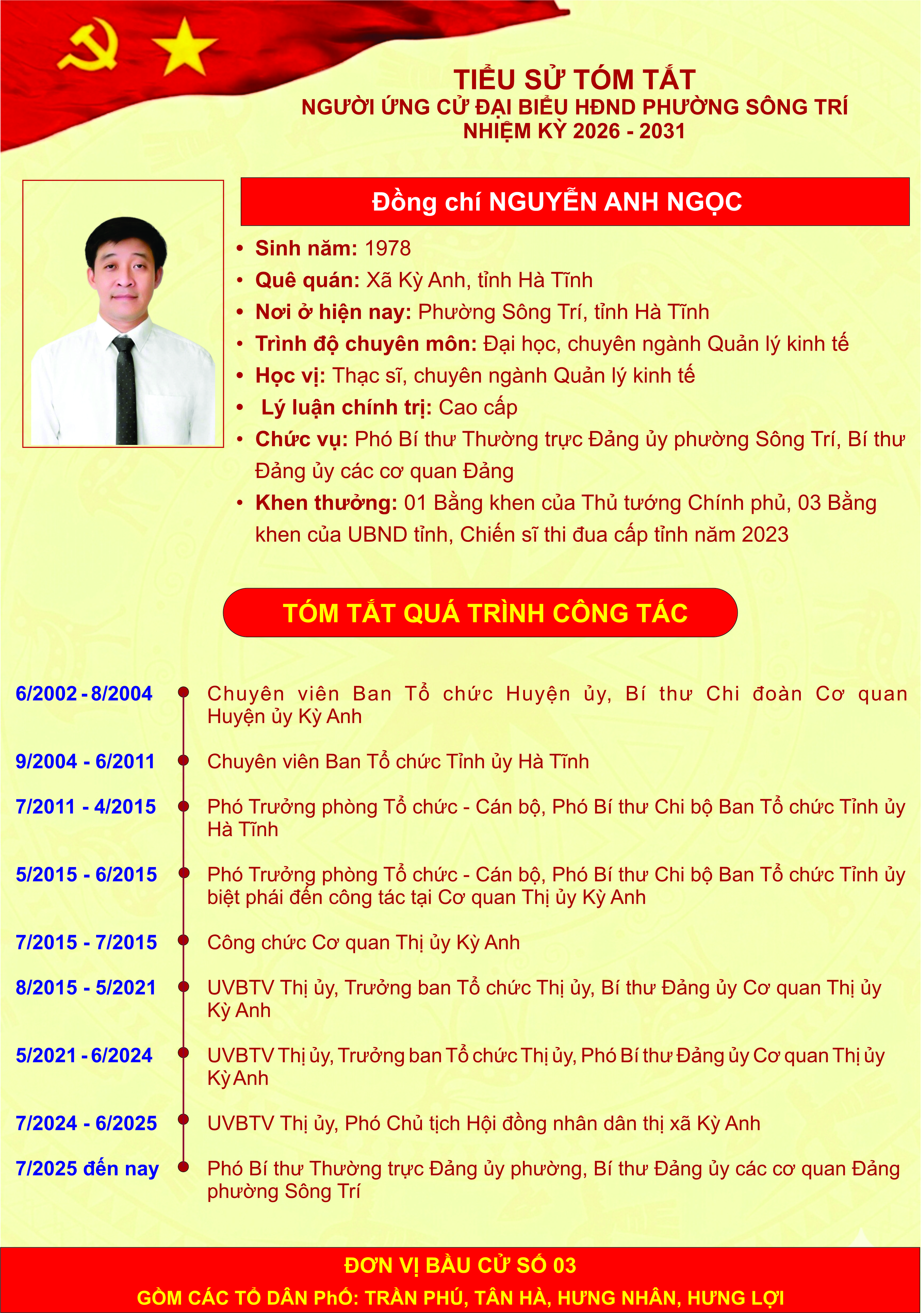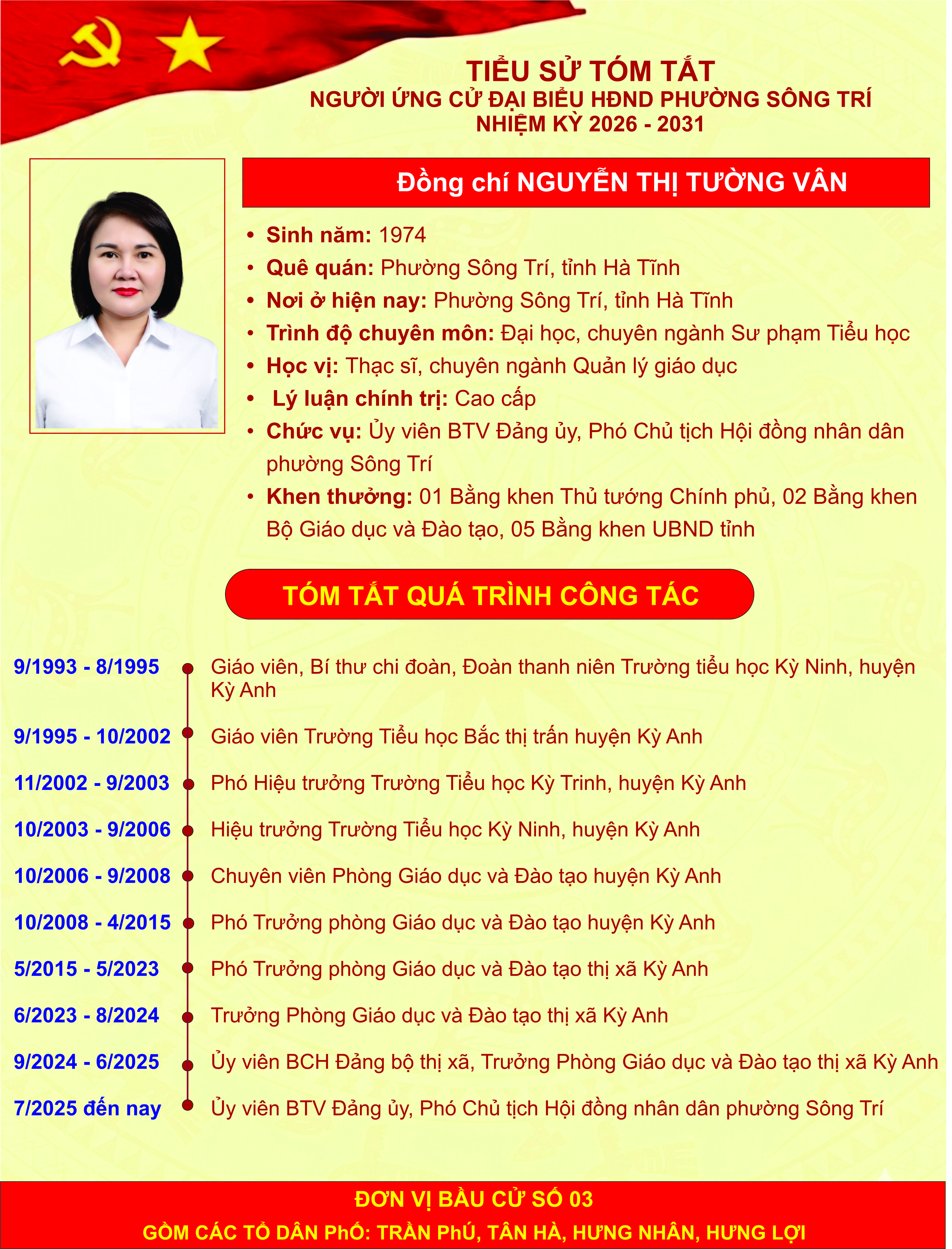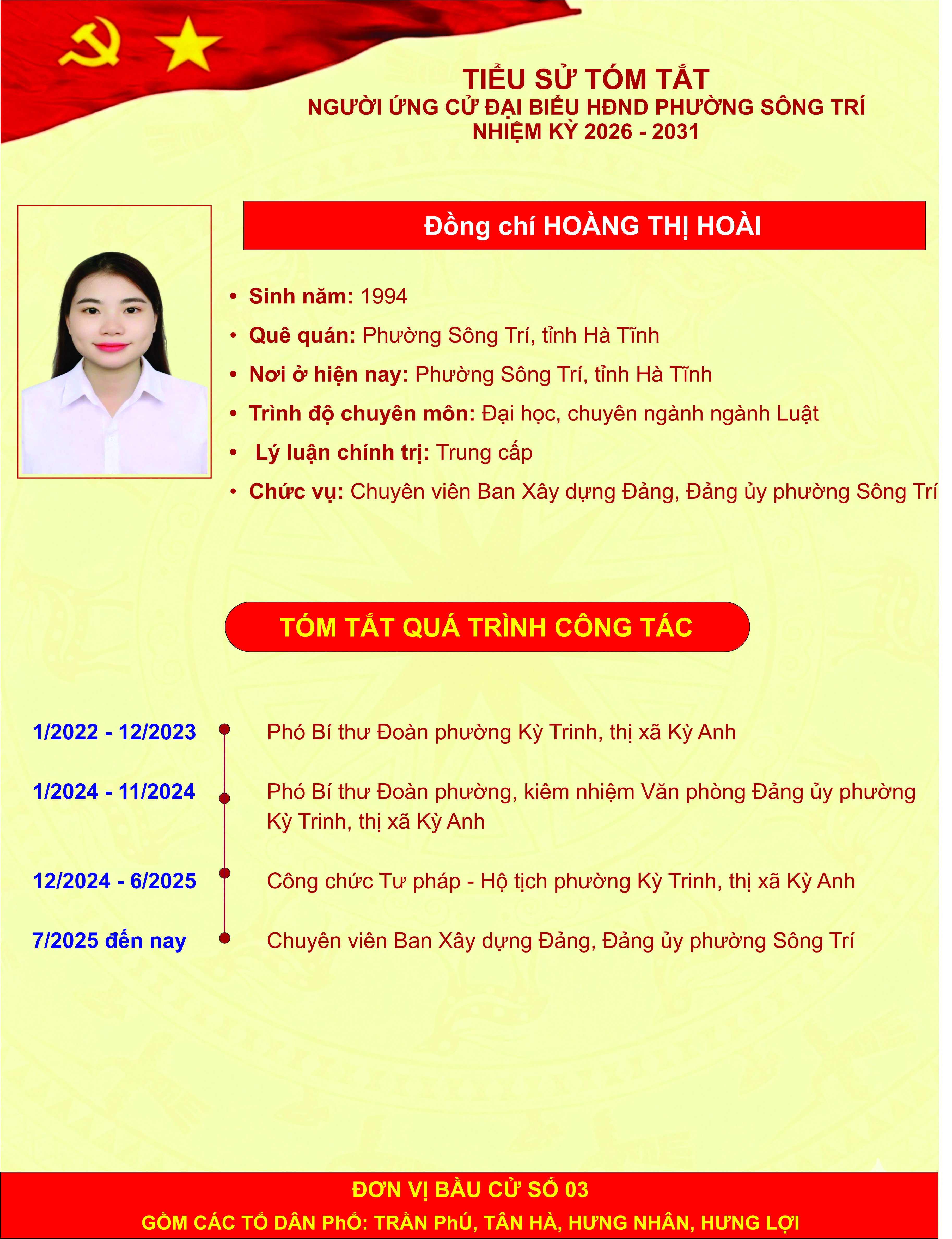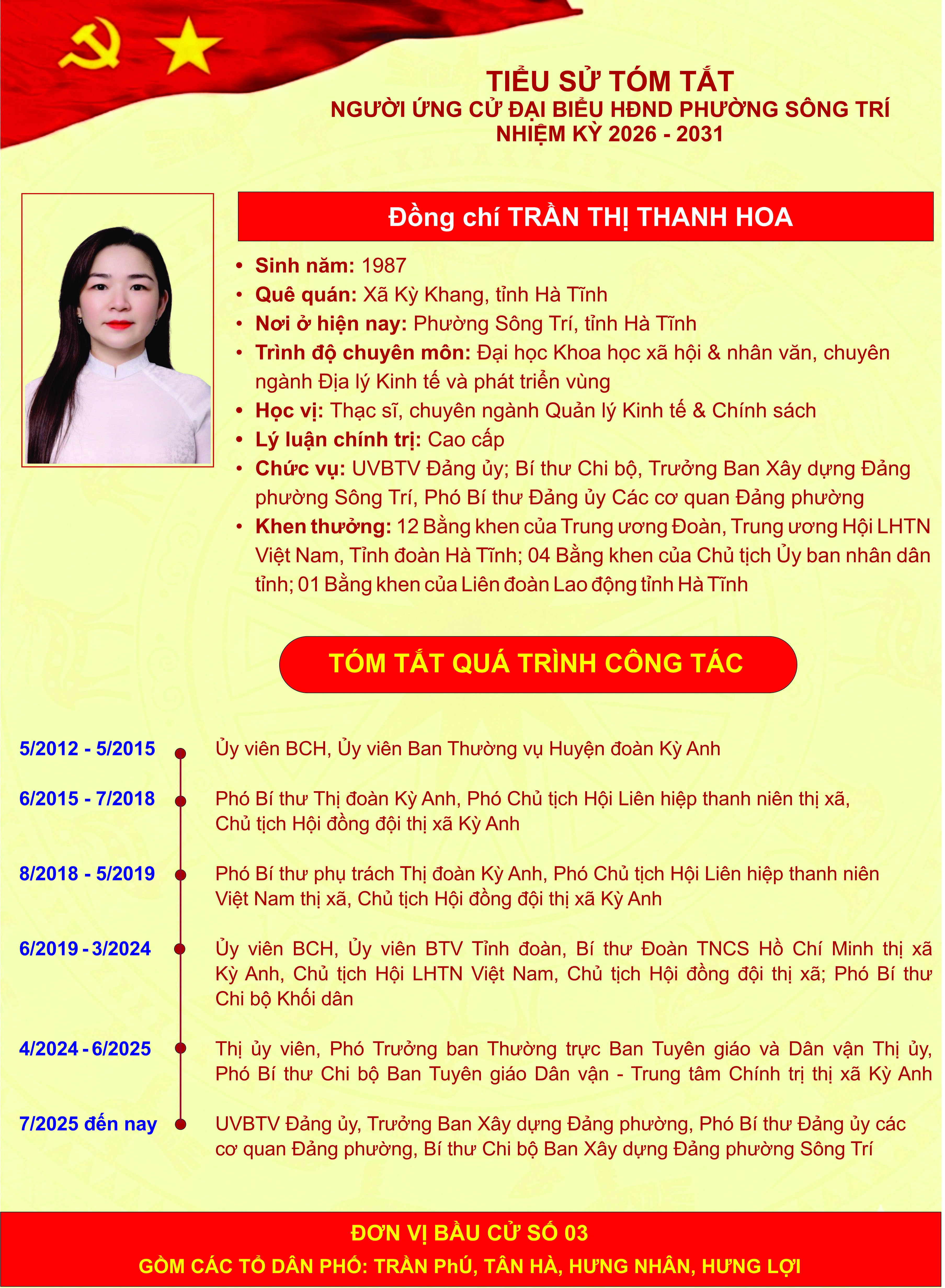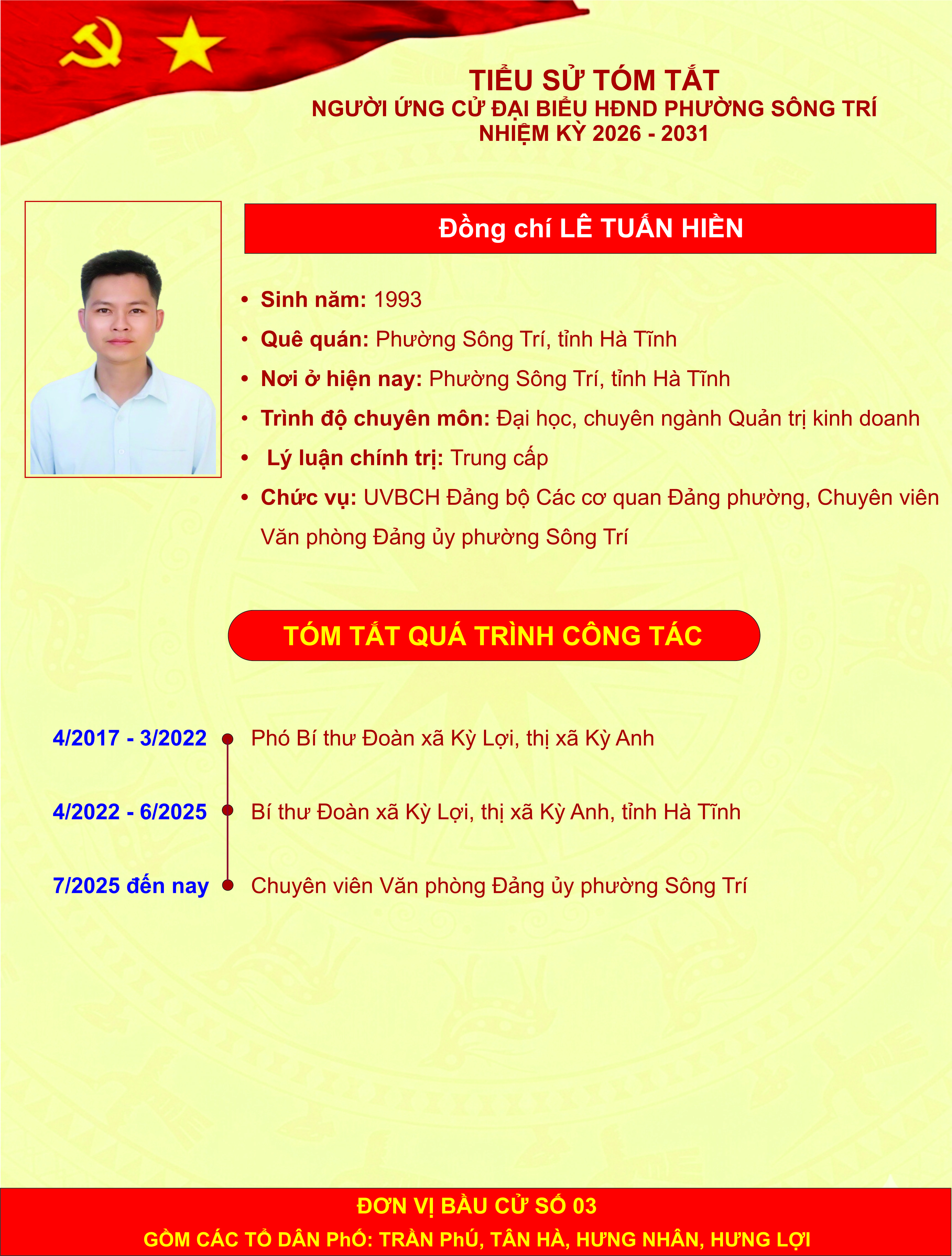 Giới thiệu thông tin của các đồng chí ứng cử đại biểu HĐND phường Sông Trí, nhiệm kỳ 2026 - 2031, tại Đơn vị bầu cử số 03 (các tổ dân phố: Trần Phú, Tân Hà, Hưng Nhân, Hưng Lợi)
