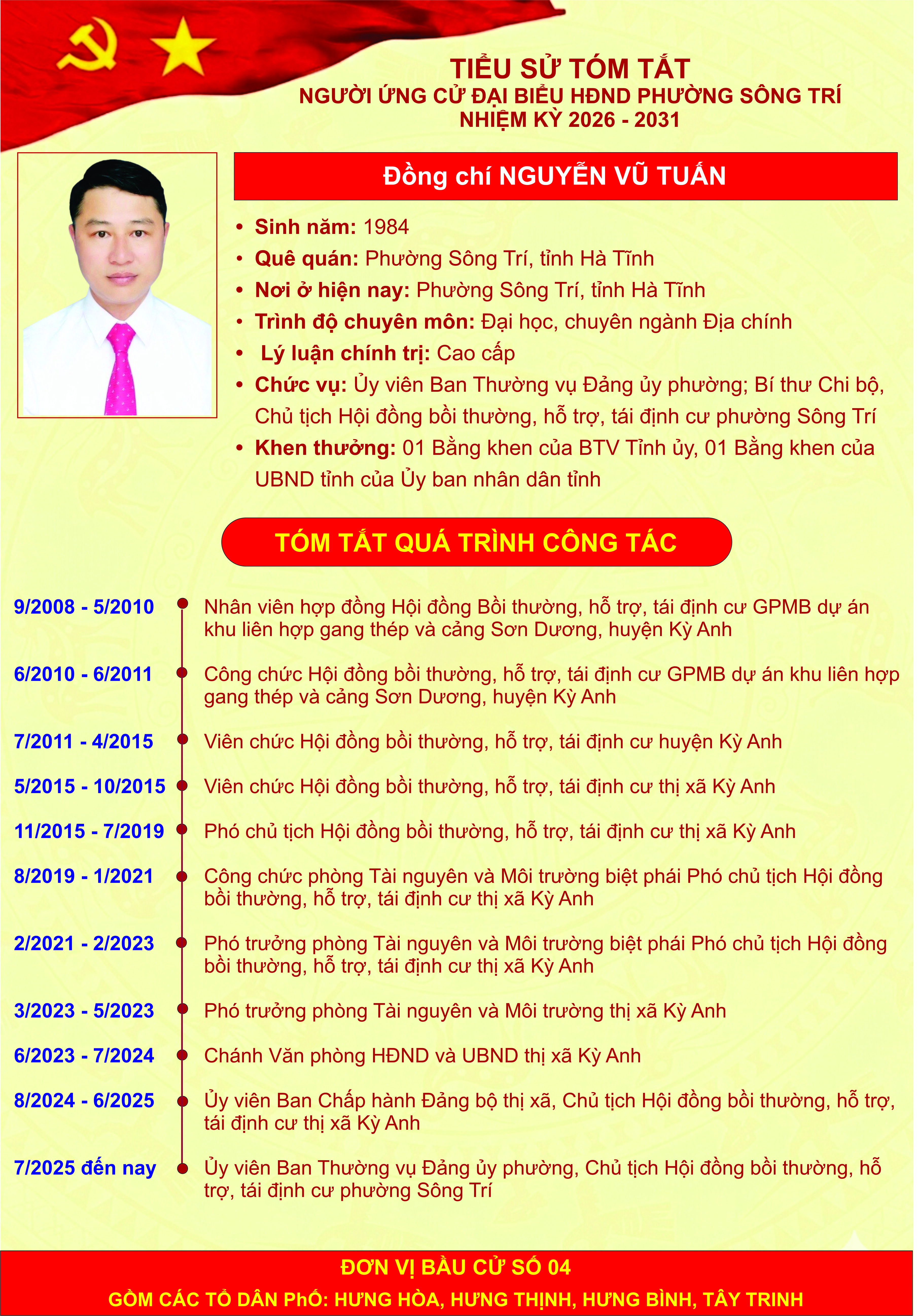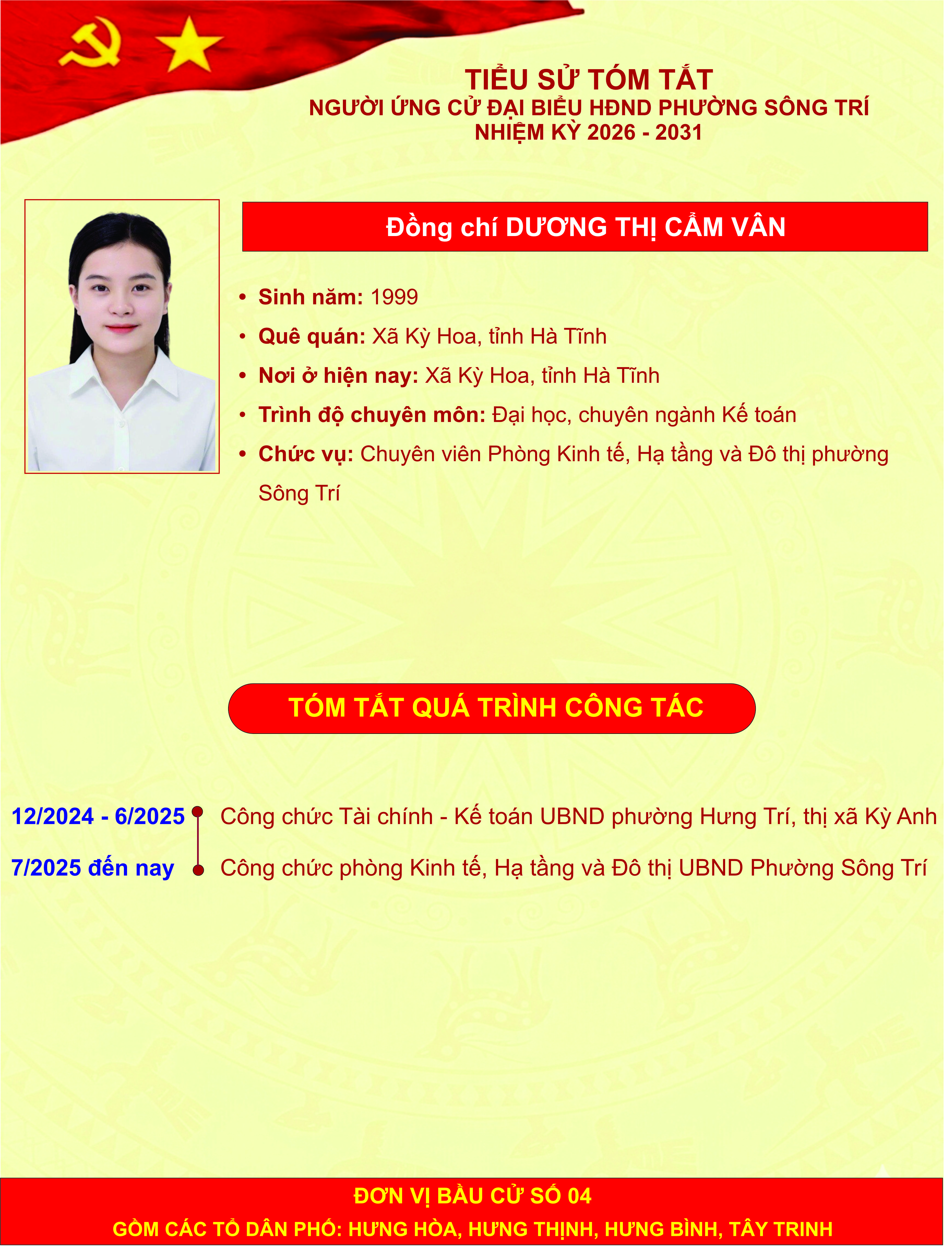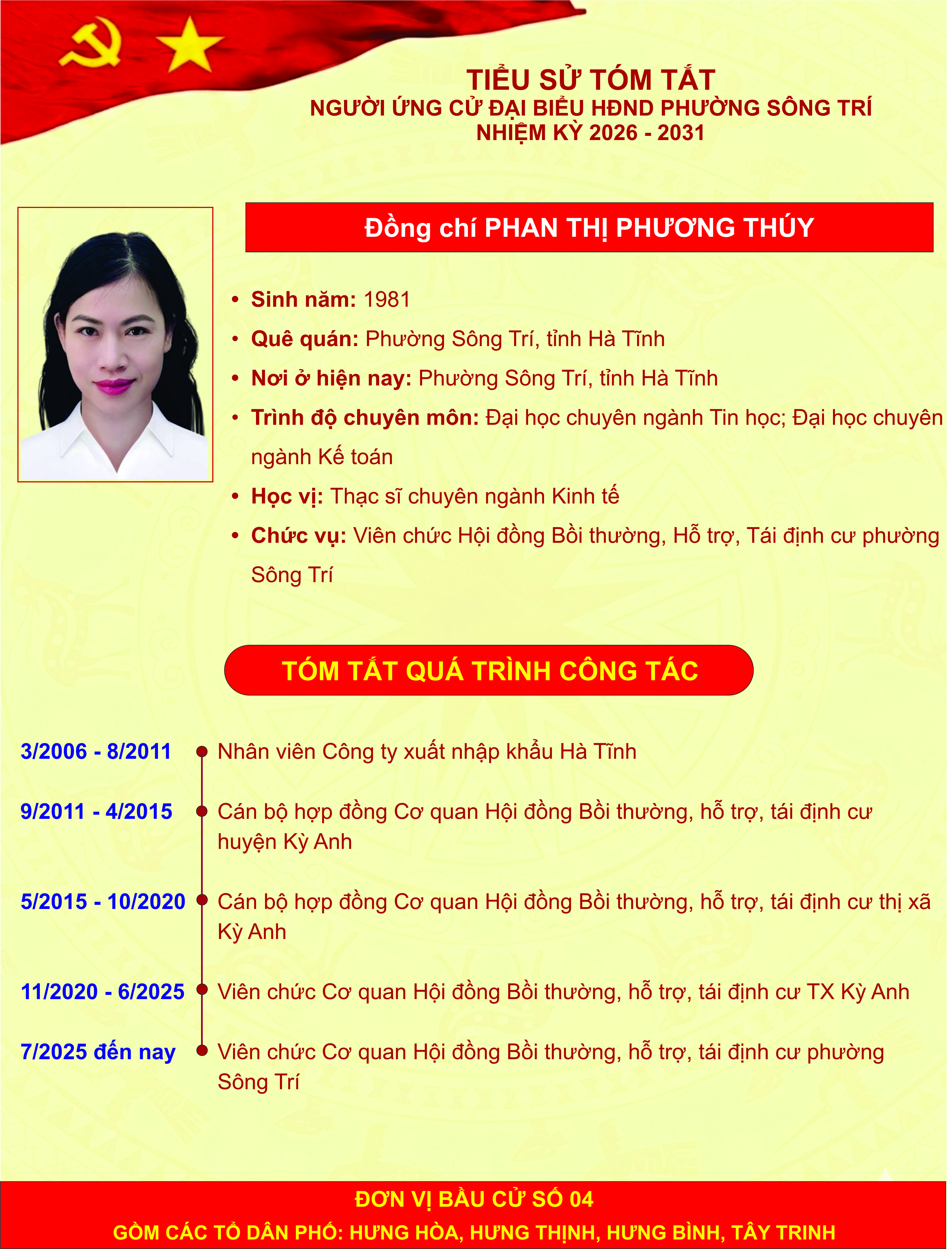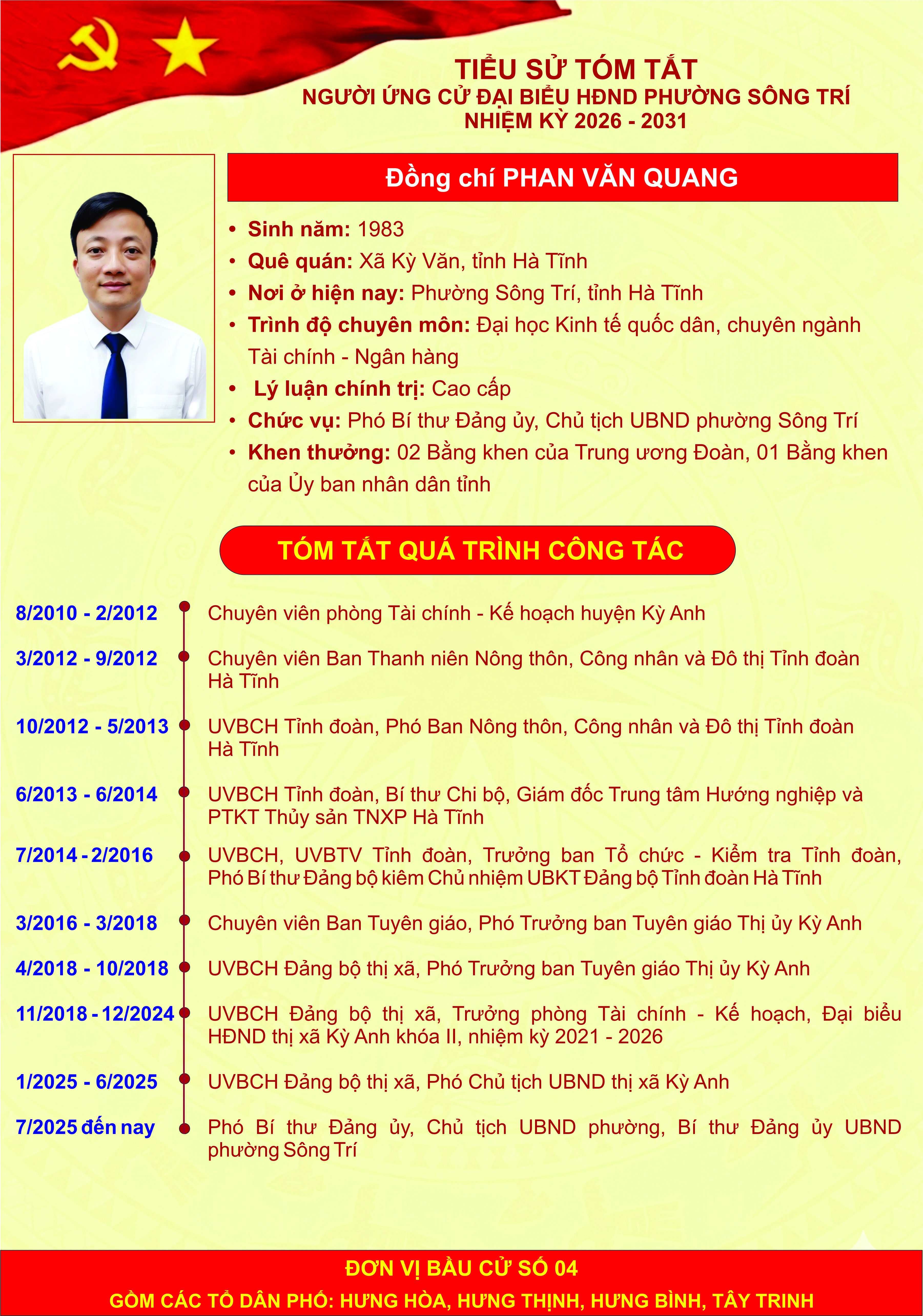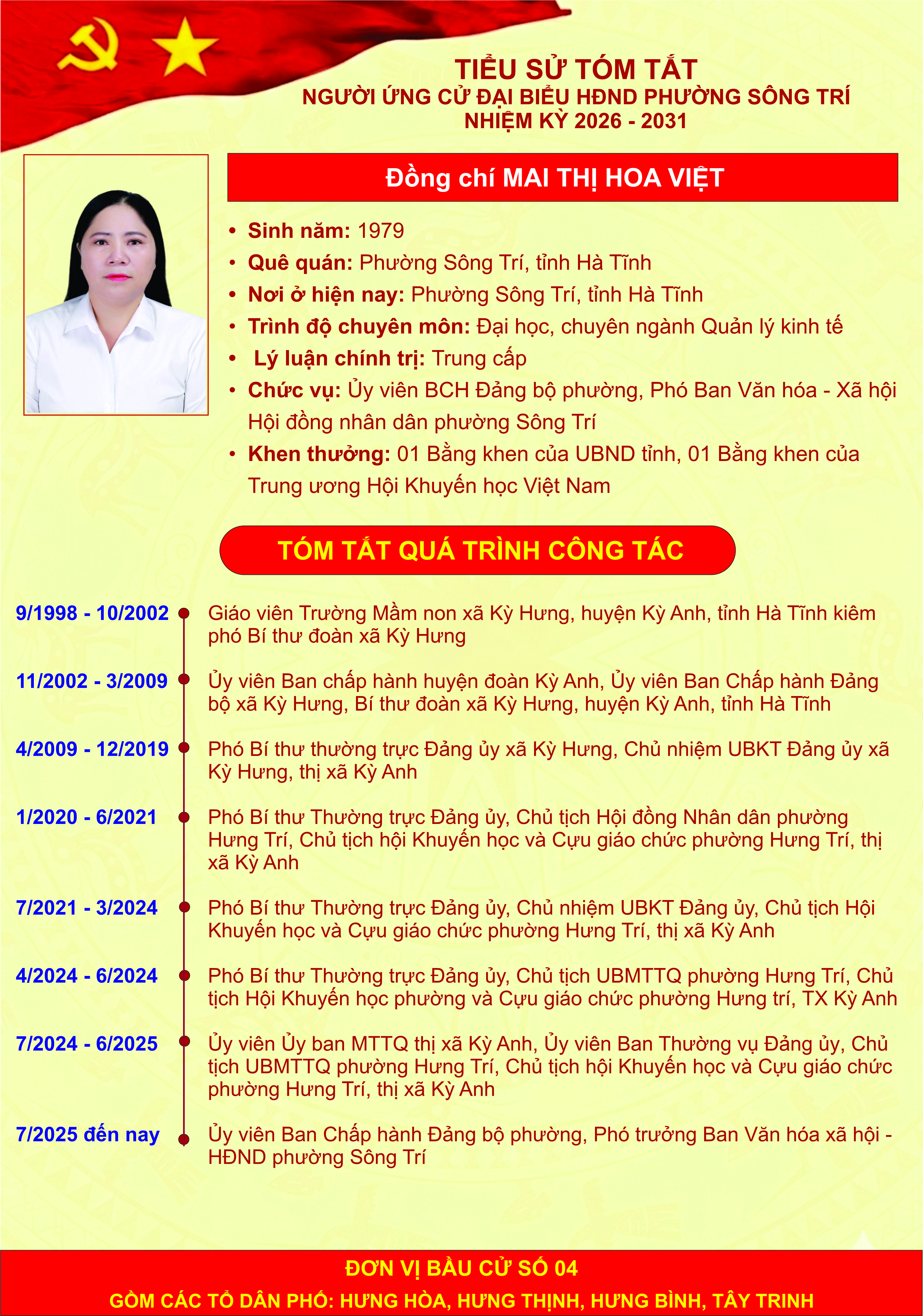 Giới thiệu thông tin của các đồng chí ứng cử đại biểu HĐND phường Sông Trí, nhiệm kỳ 2026 - 2031, tại Đơn vị bầu cử số 04 (các tổ dân phố: Hưng Hòa, Hưng Thịnh, Hưng Bình, Tây Trinh)