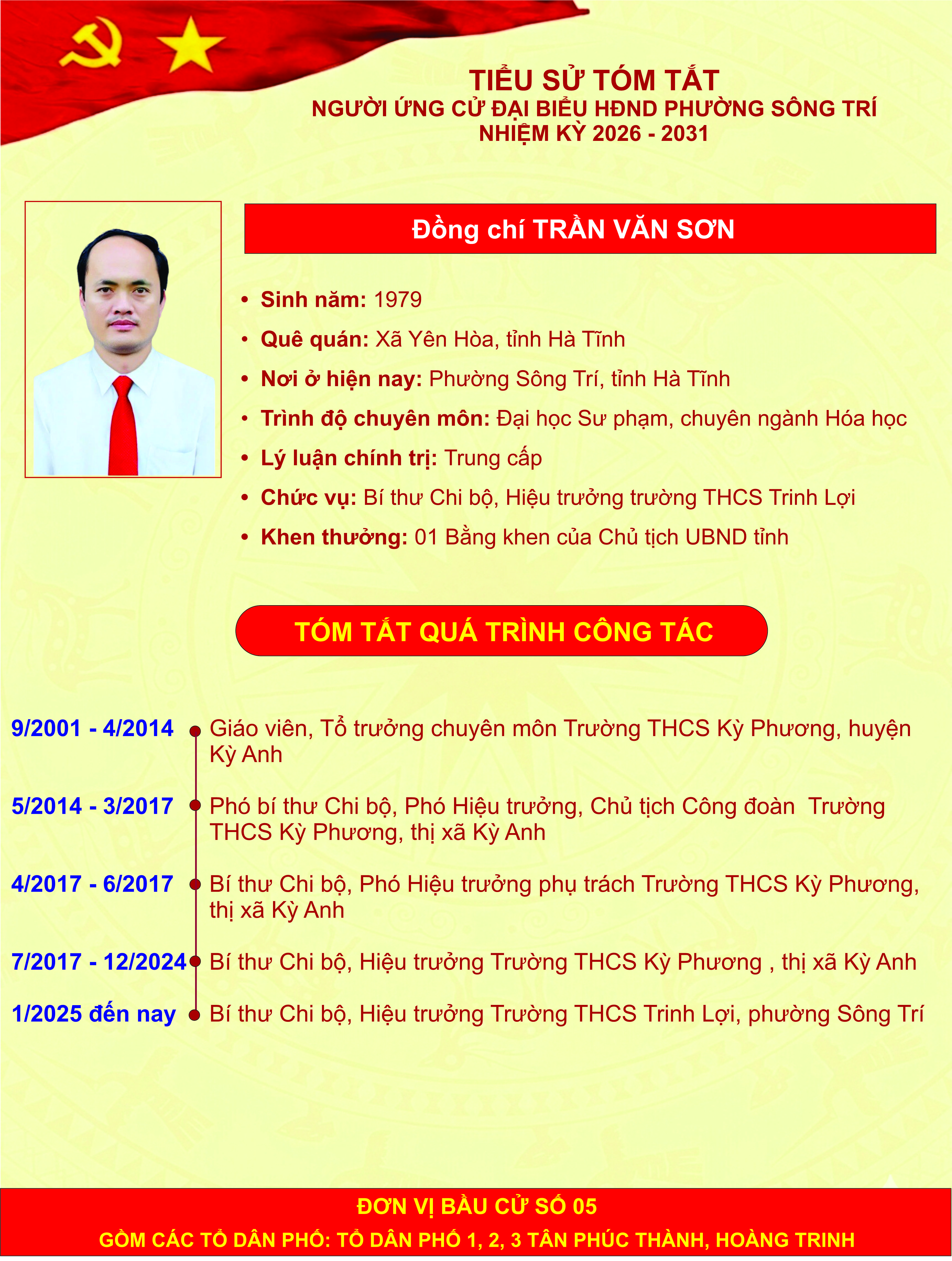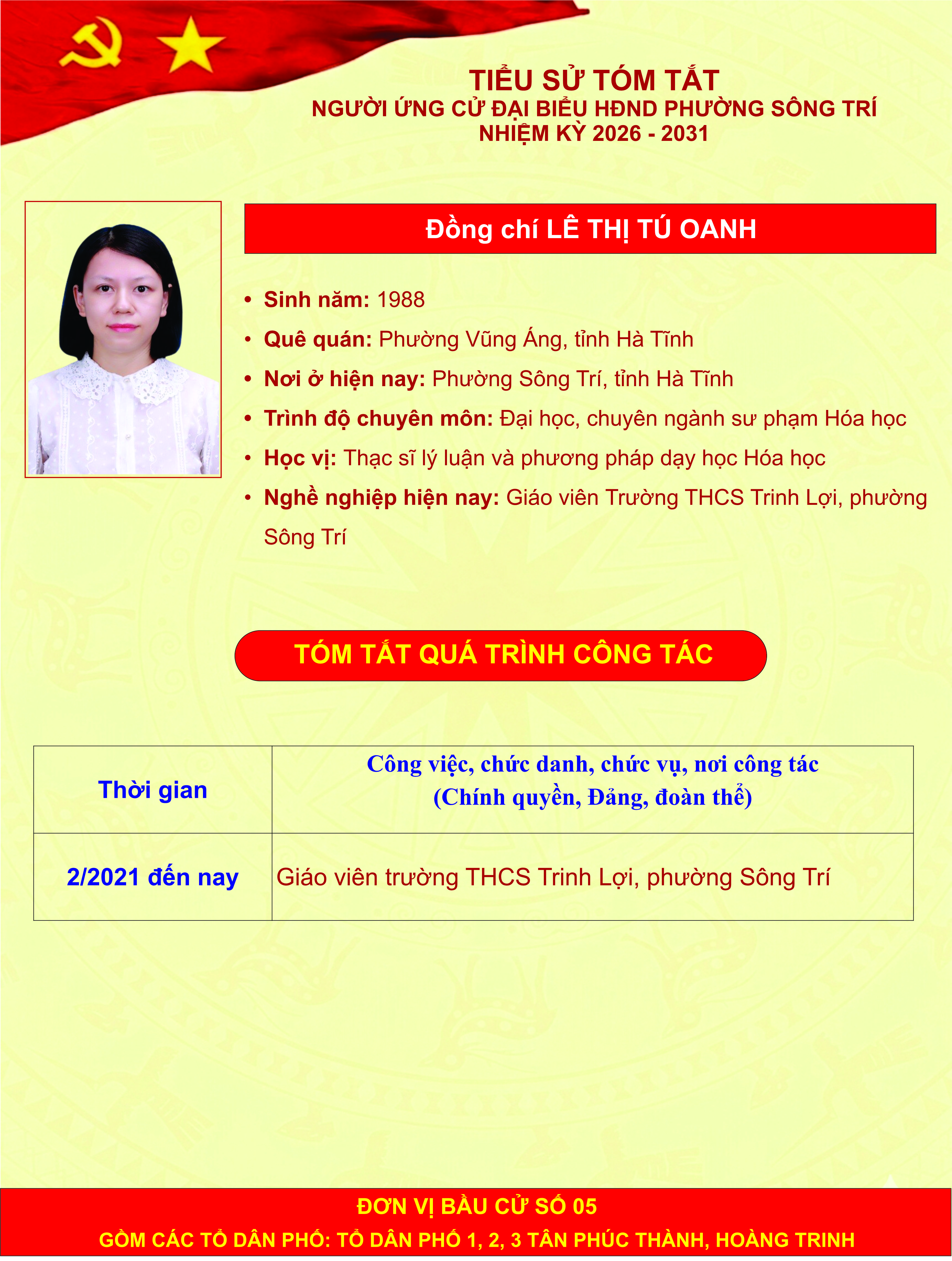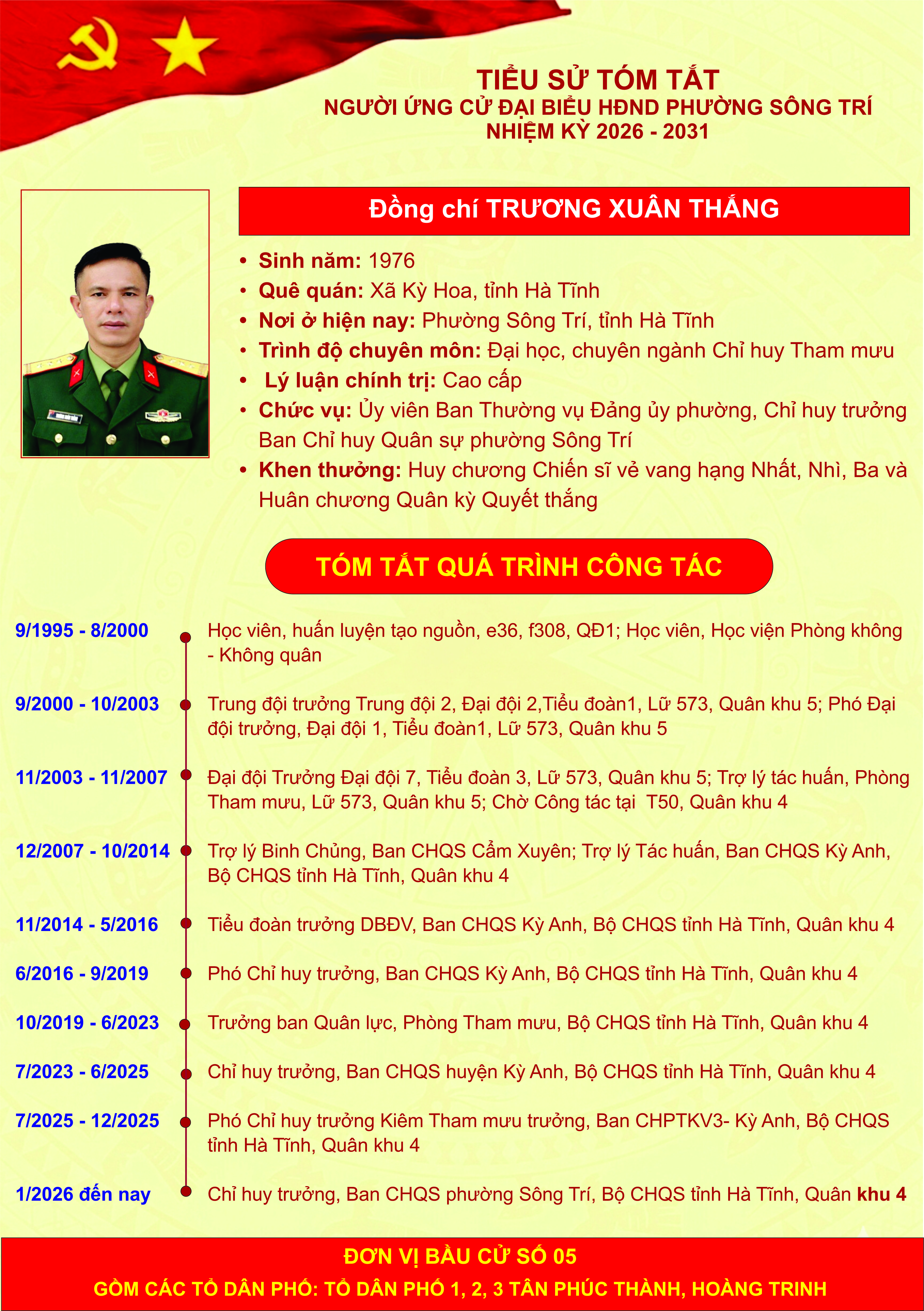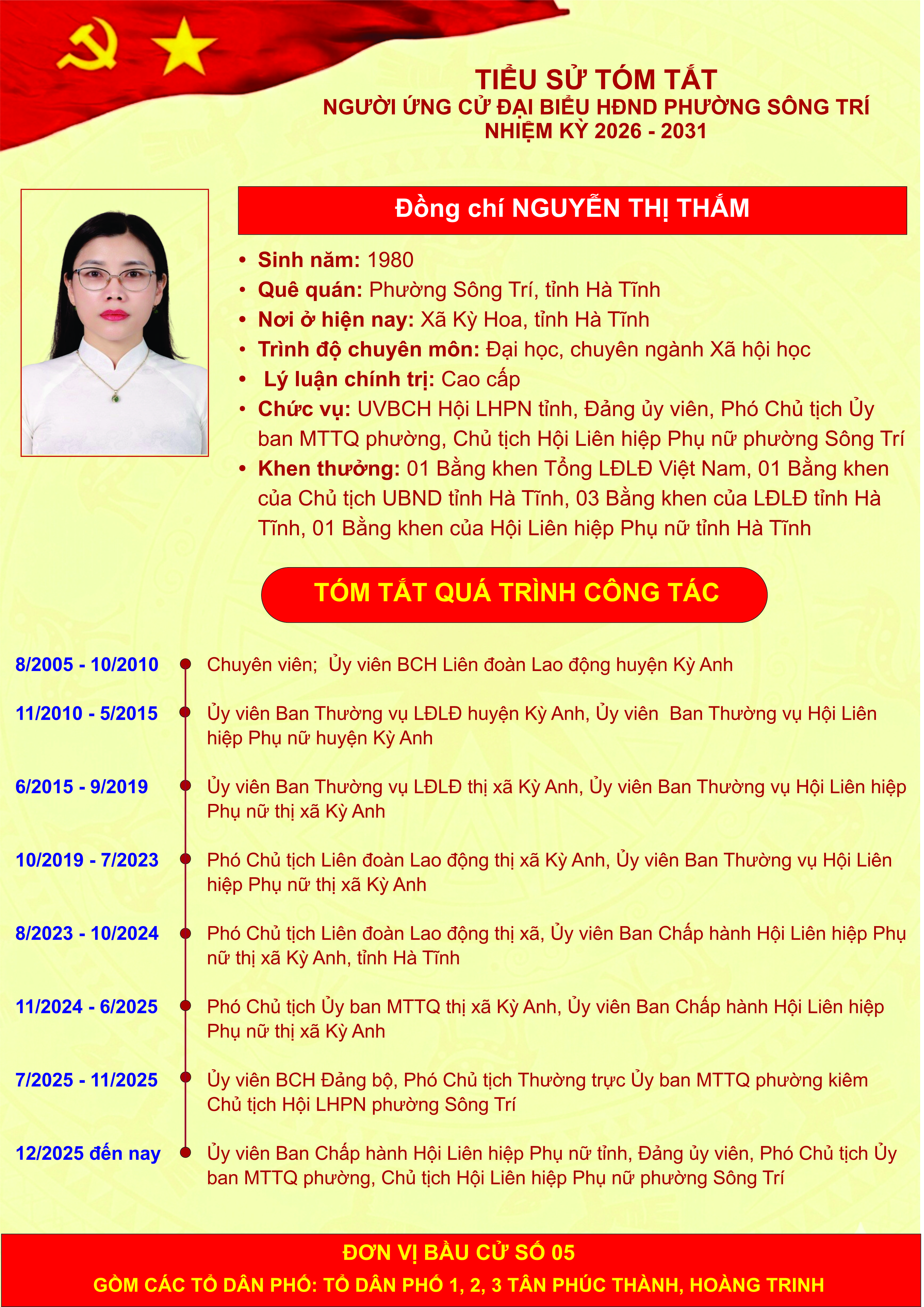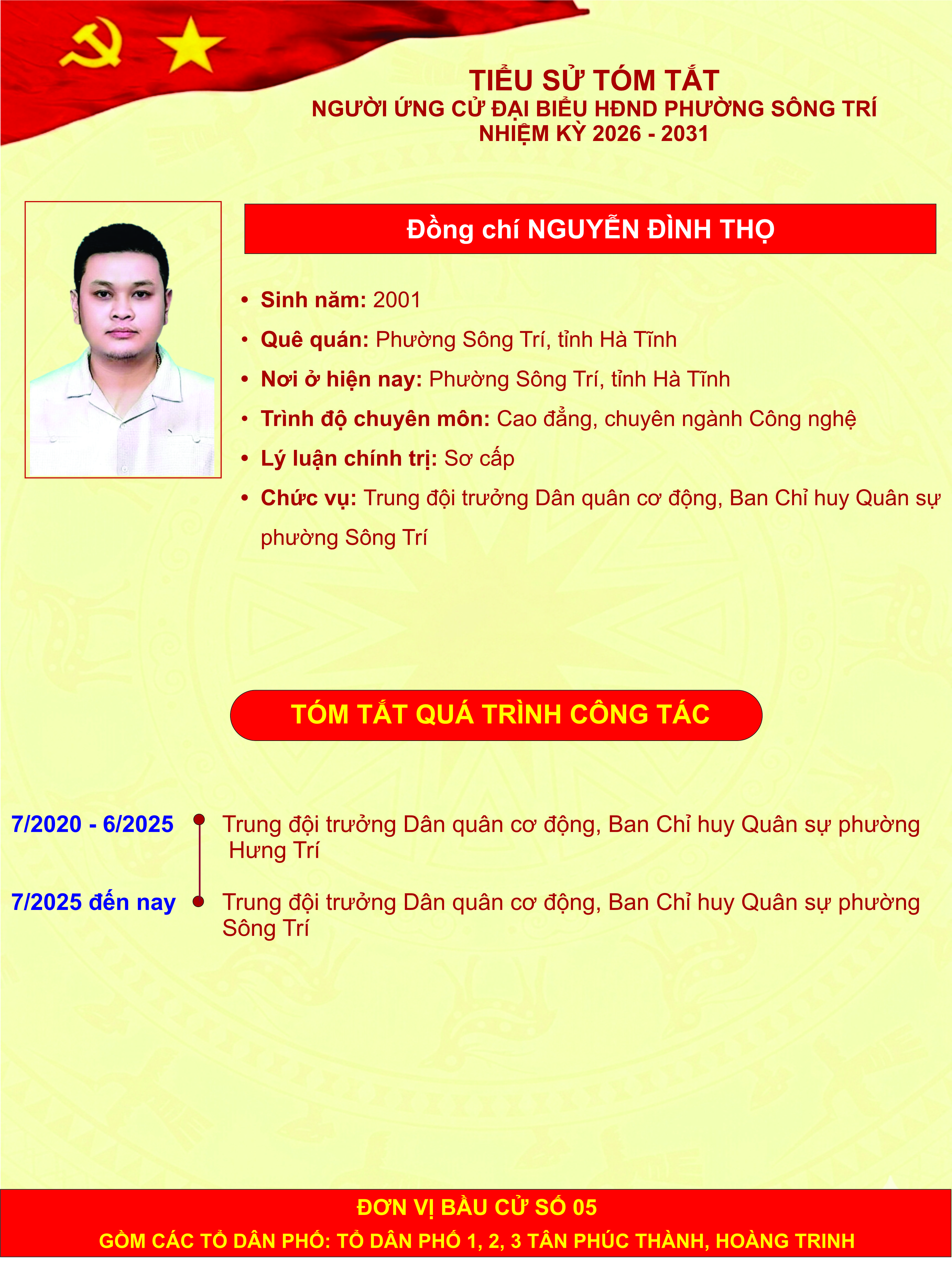 Giới thiệu thông tin của các đồng chí ứng cử đại biểu HĐND phường Sông Trí, nhiệm kỳ 2026 - 2031, tại Đơn vị bầu cử số 05 (các tổ dân phố: Tổ dân phố 1, 2, 3 Tân Phúc Thành, Hoàng Trinh)