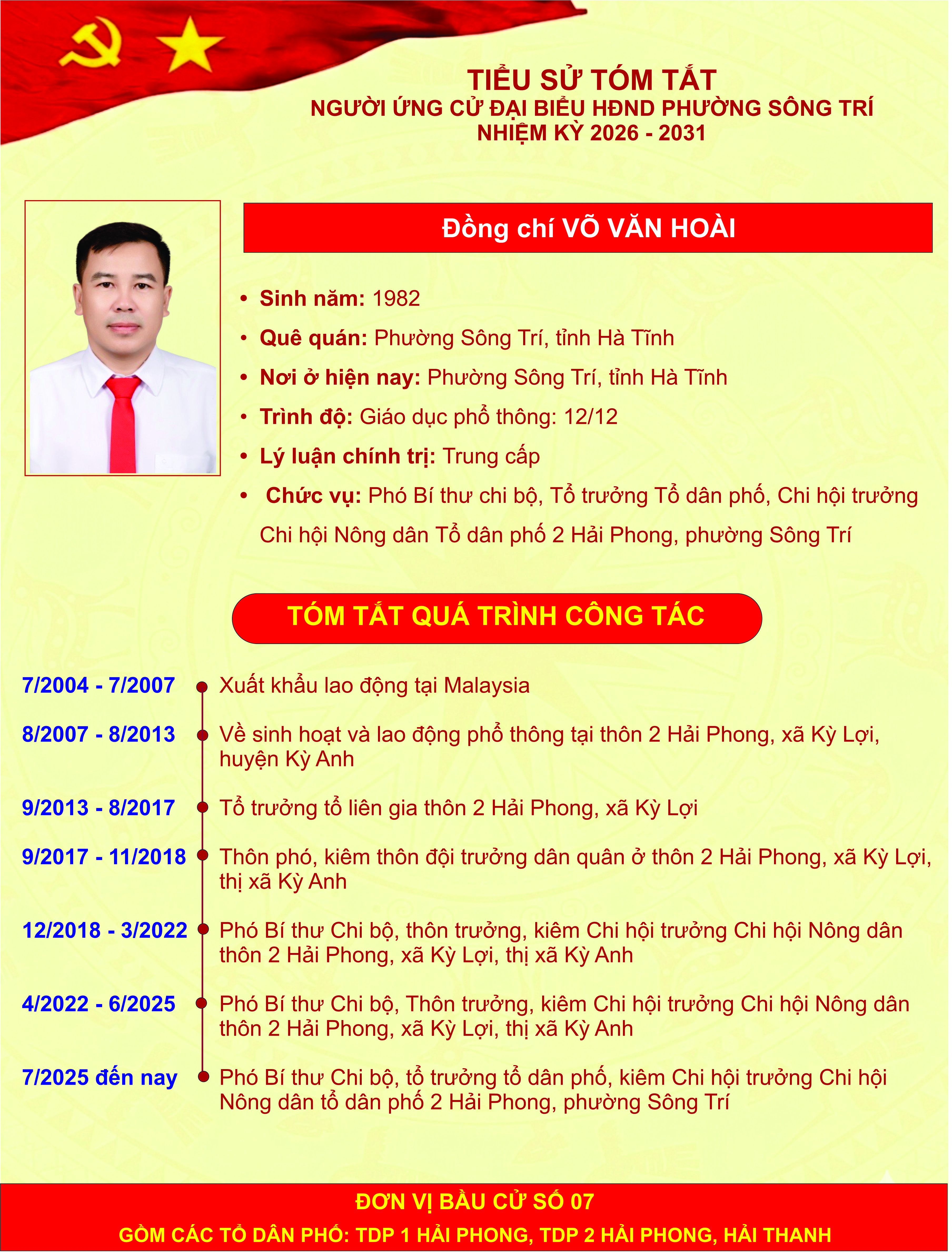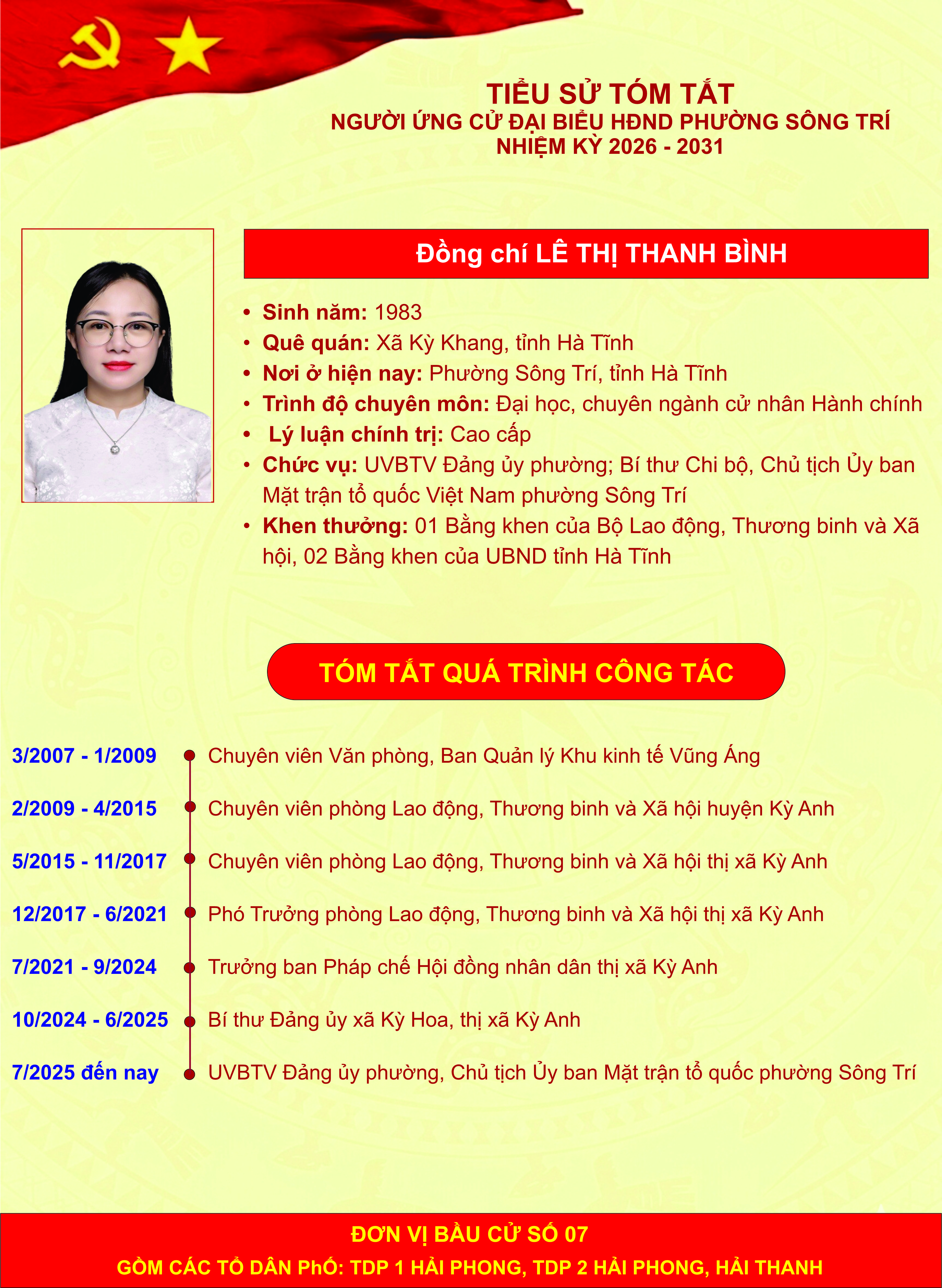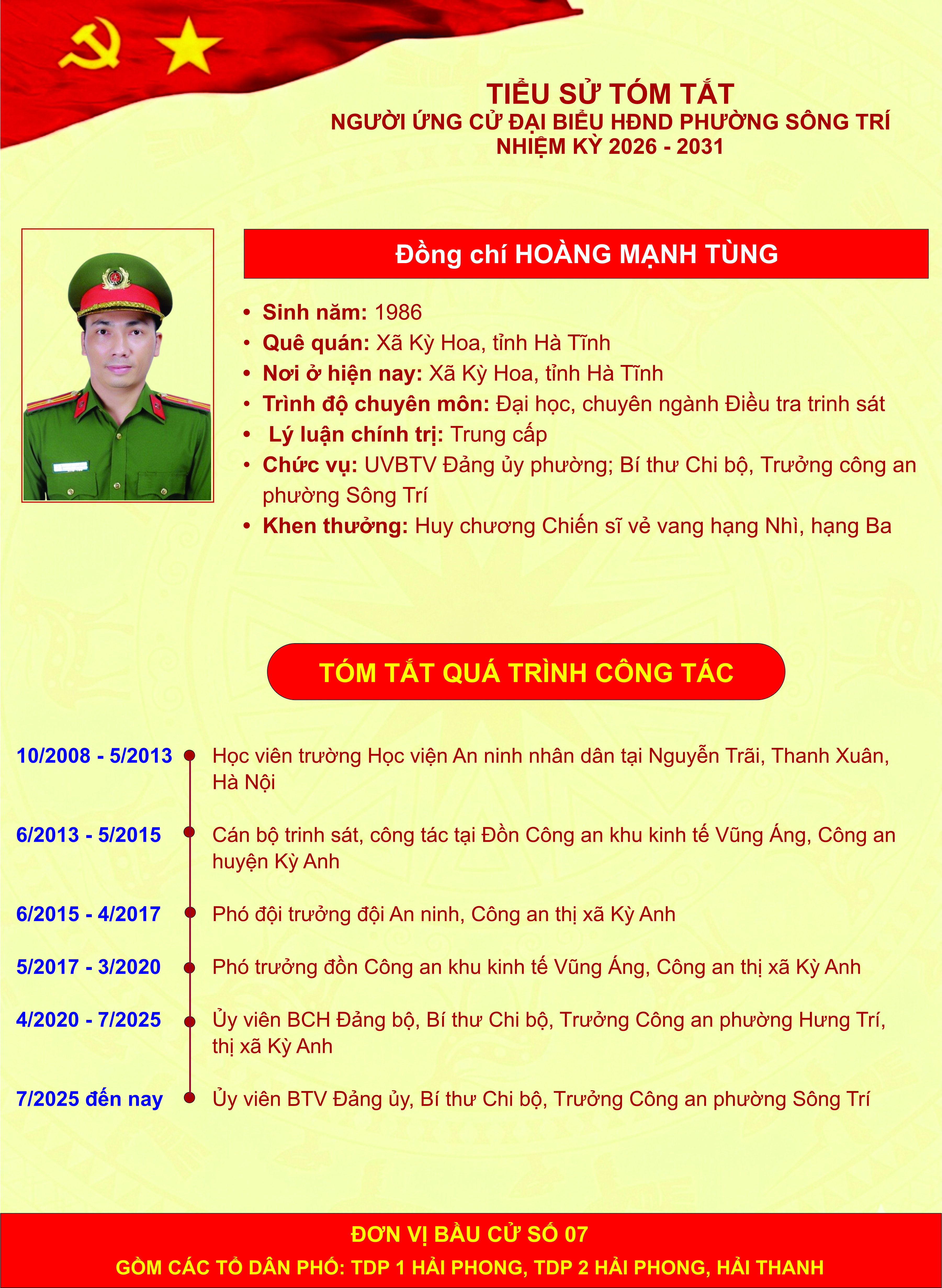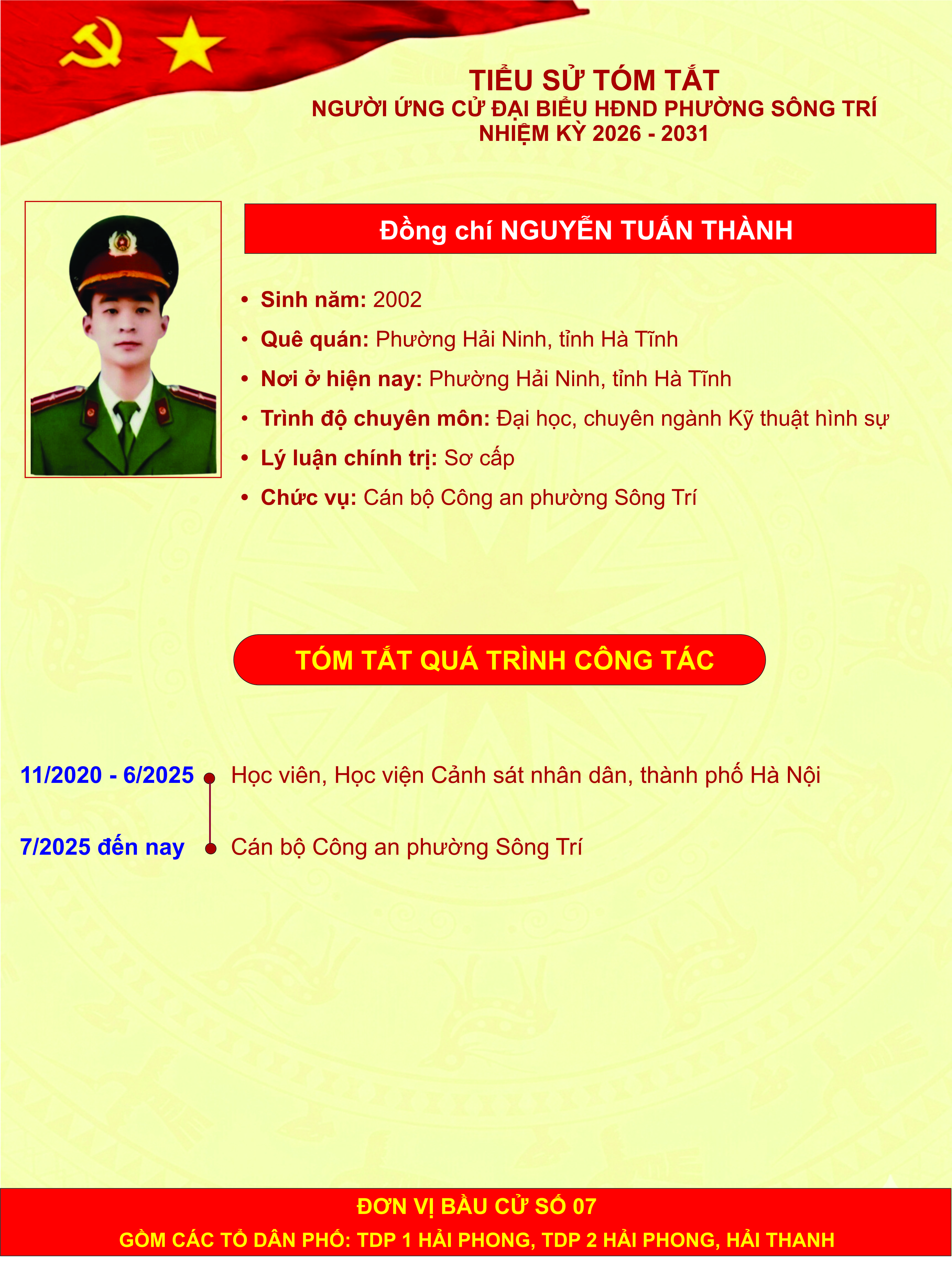 Giới thiệu thông tin của các đồng chí ứng cử đại biểu HĐND phường Sông Trí, nhiệm kỳ 2026 - 2031, tại Đơn vị bầu cử số 07 (các tổ dân phố: TDP 1 Hải Phong, TDP 2 Hải Phong, Hải Thanh)