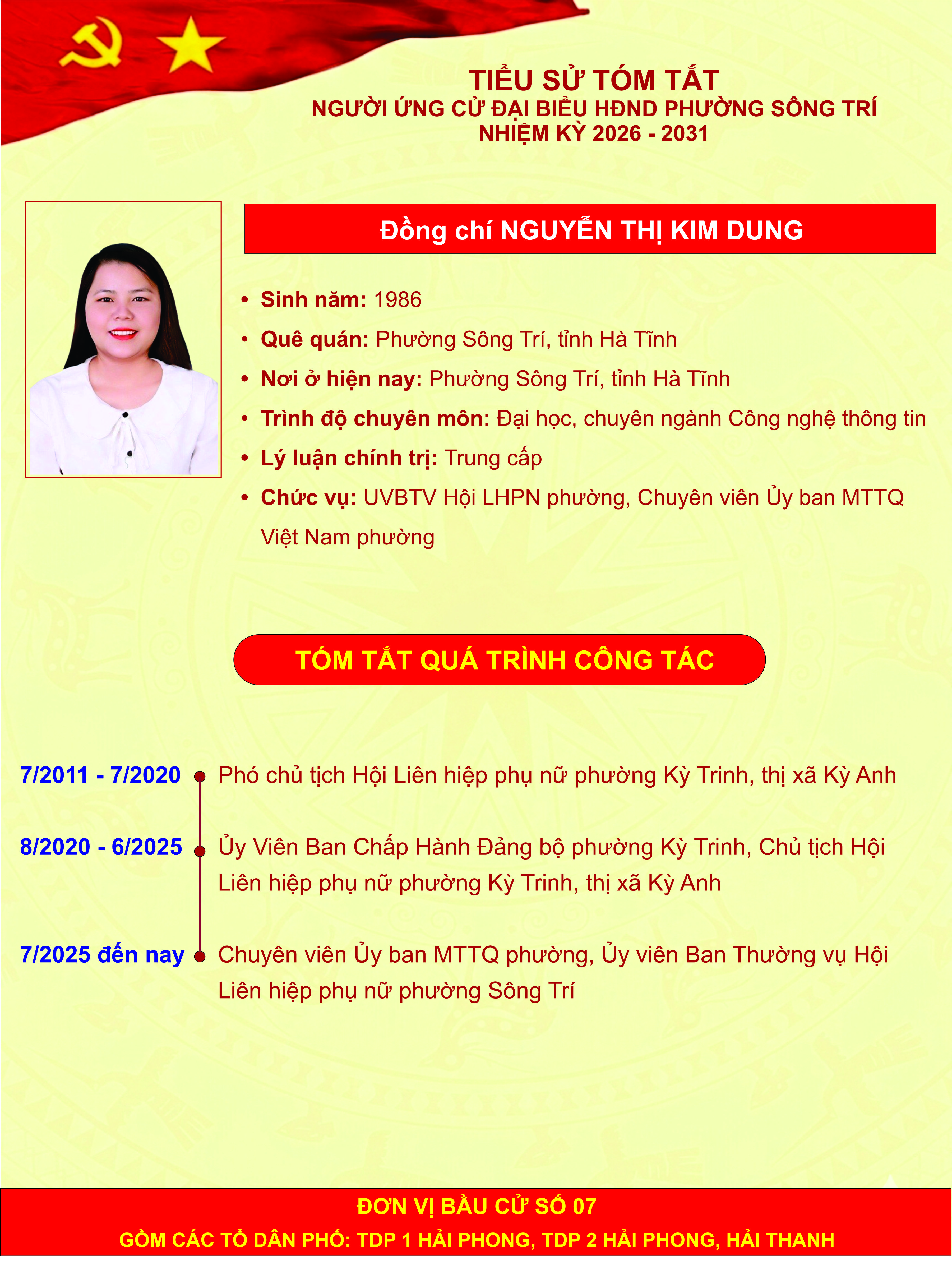 2. Đồng chí Nguyễn Thị Kim Dung - Chuyên viên Ủy ban MTTQ phường, Ủy viên Ban Thường Hội LHPN phường Sông Trí.