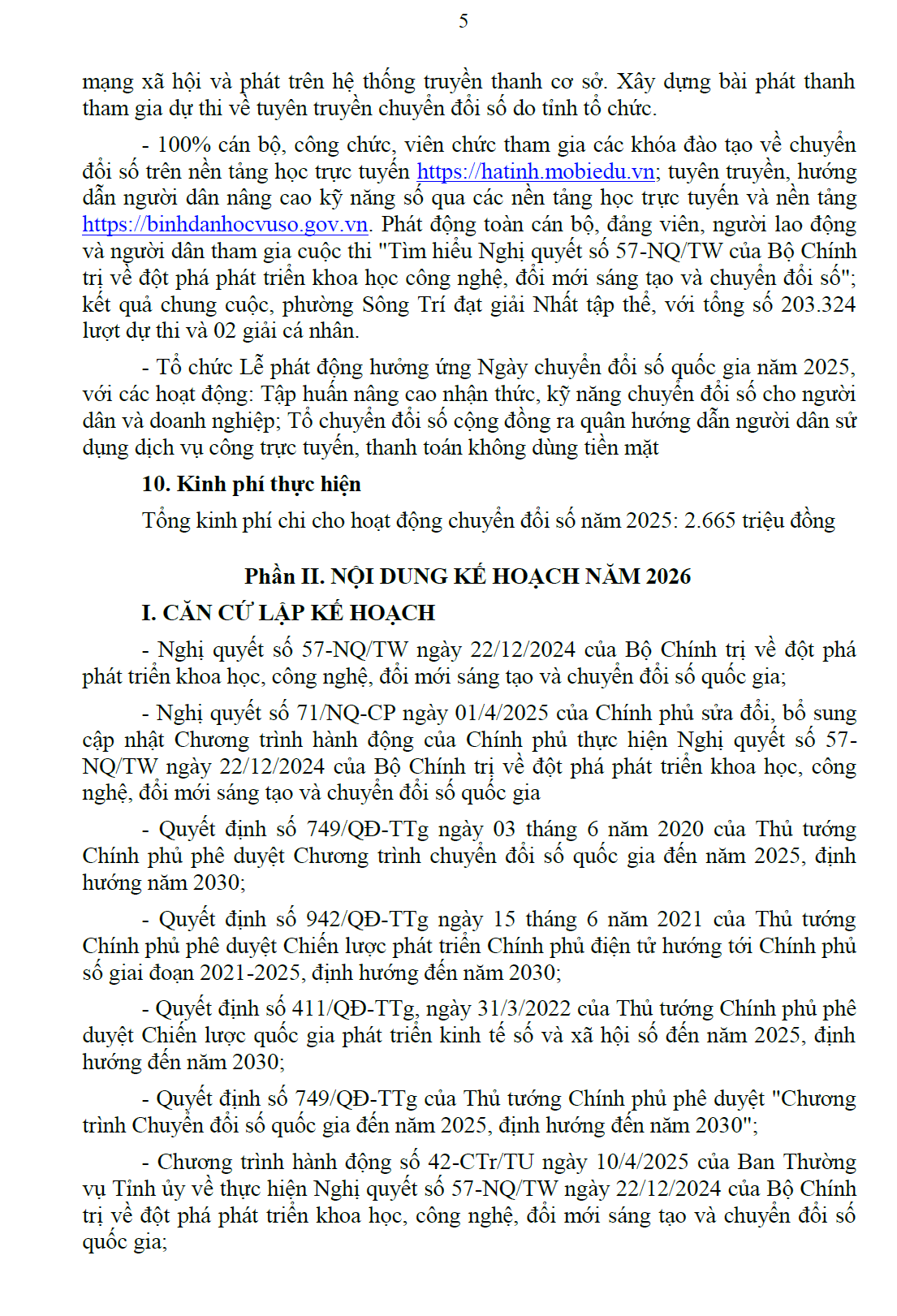 Thực hiện Văn bản số 3063/SKHCN-CĐS ngày 23/10/2025 của Sở Khoa học và Công nghệ về việc hướng dẫn xây dựng Kế hoạch chuyển đổi số năm 2026; Ủy ban nhân dân phường Sông Trí xây dựng kế hoạch chuyển đổi số trên địa bàn phường năm 2026 như sau:
