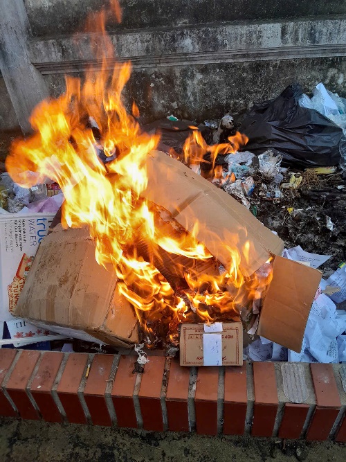Tại địa điểm tiêu hủy, Hội đồng tiêu hủy đã xem xét, đối chiếu từng bản án, quyết định, kiểm tra tình trạng niêm phong các mẫu vật giám định. Sau khi đã kiểm tra toàn bộ vật chứng, Hội đồng tiêu hủy xác định đúng số lượng, chủng loại được thể hiện trong từng bản án và quyết định chuyển giao vật chứng; đồng thời, mở niêm phong và đưa ra tiêu hủy với biện pháp đốt cháy hoàn toàn những vật dễ cháy, dùng máy cắt cắt nát những vật không đốt cháy được.
