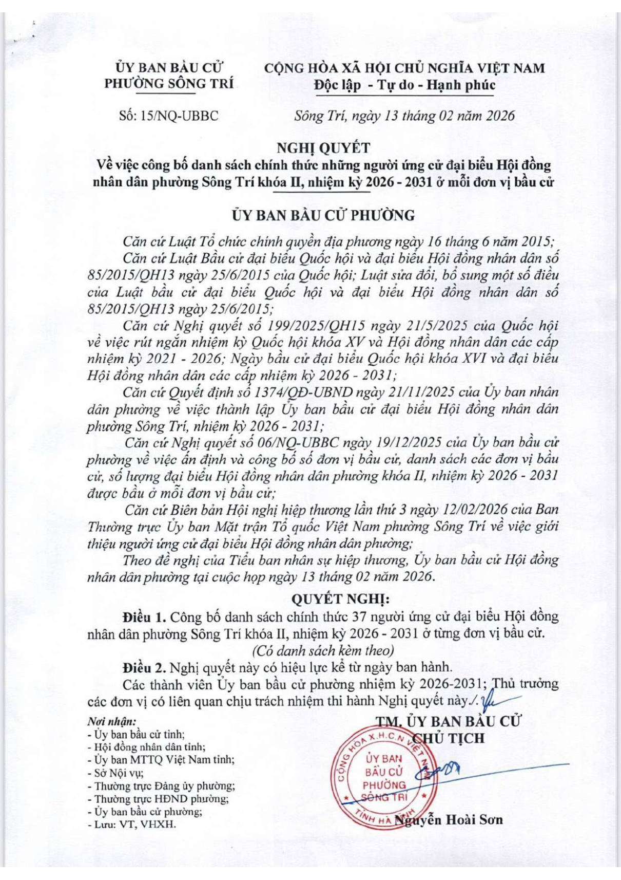 Nghị quyết công bố danh sách chính thức những người ứng cử đại biểu Hội đồng nhân dân phường Sông Trí khóa II, nhiệm kỳ 2026 - 2031Ẩn danh13/02/2026A -A+Ẩn danh13/02/2026A -A+