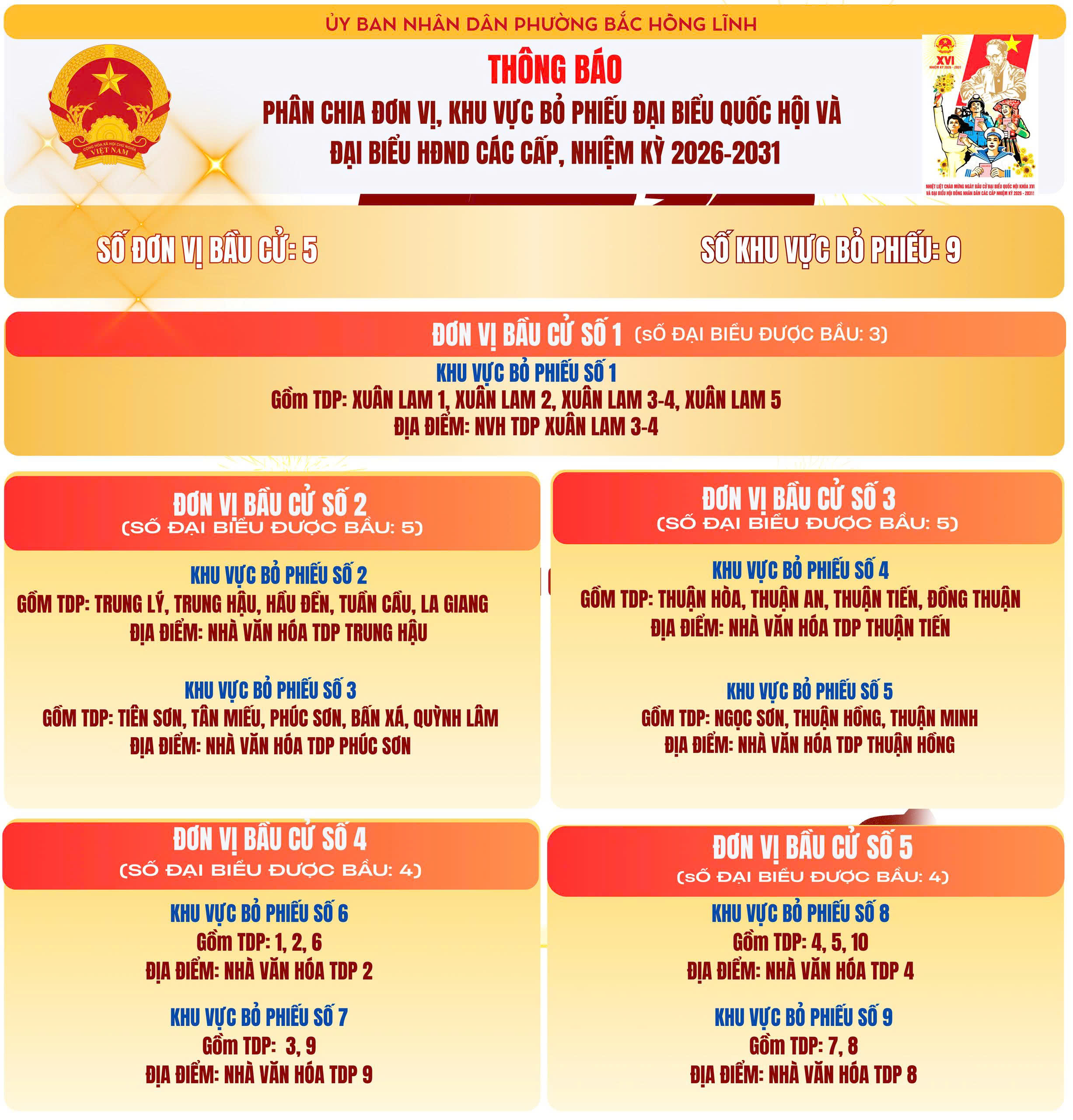 Phân chia khu vực bỏ phiếu bầu cử đại biểu Quốc hội khóa XVI và bầu cử đại biểu HĐND các cấp, nhiệm kỳ 2026-2031 trên địa bàn phường Bắc Hồng Lĩnh