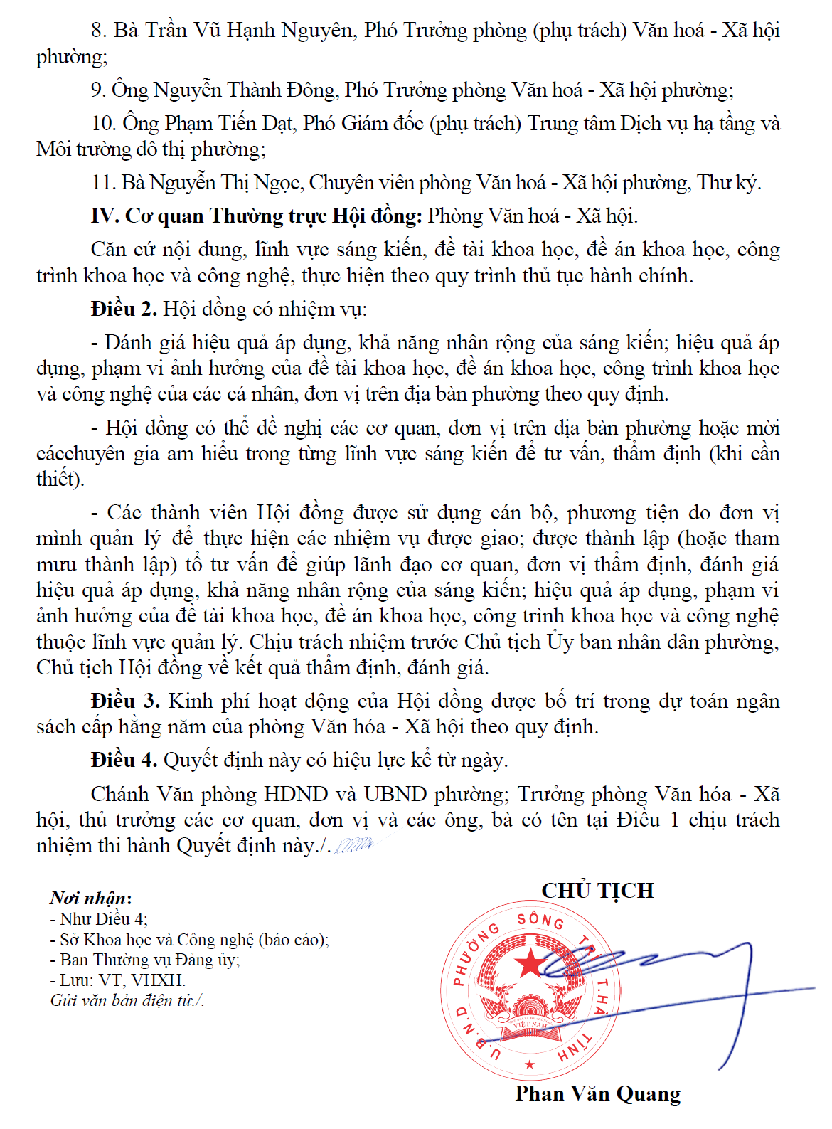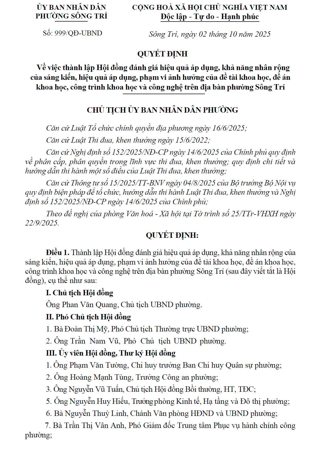 Quyết định số 999/QĐ-UBND về việc thành lập Hội đồng đánh giá hiệu quả áp dụng, khả năng nhân rộng của sáng kiến, hiệu quả áp dụng, phạm vi ảnh hưởng của đề tài khoa học, đề án khoa học, công trình khoa học và công nghệ trên địa bàn phường Sông TríẨn danh03/10/2025A -A+Ẩn danh03/10/2025A -A+ File đính kèm999-Quyet-dinh-cong-nhan-sang-kien-kinh-nghiem-nam-2025(03.10.2025_16h30p16)_signed.pdf