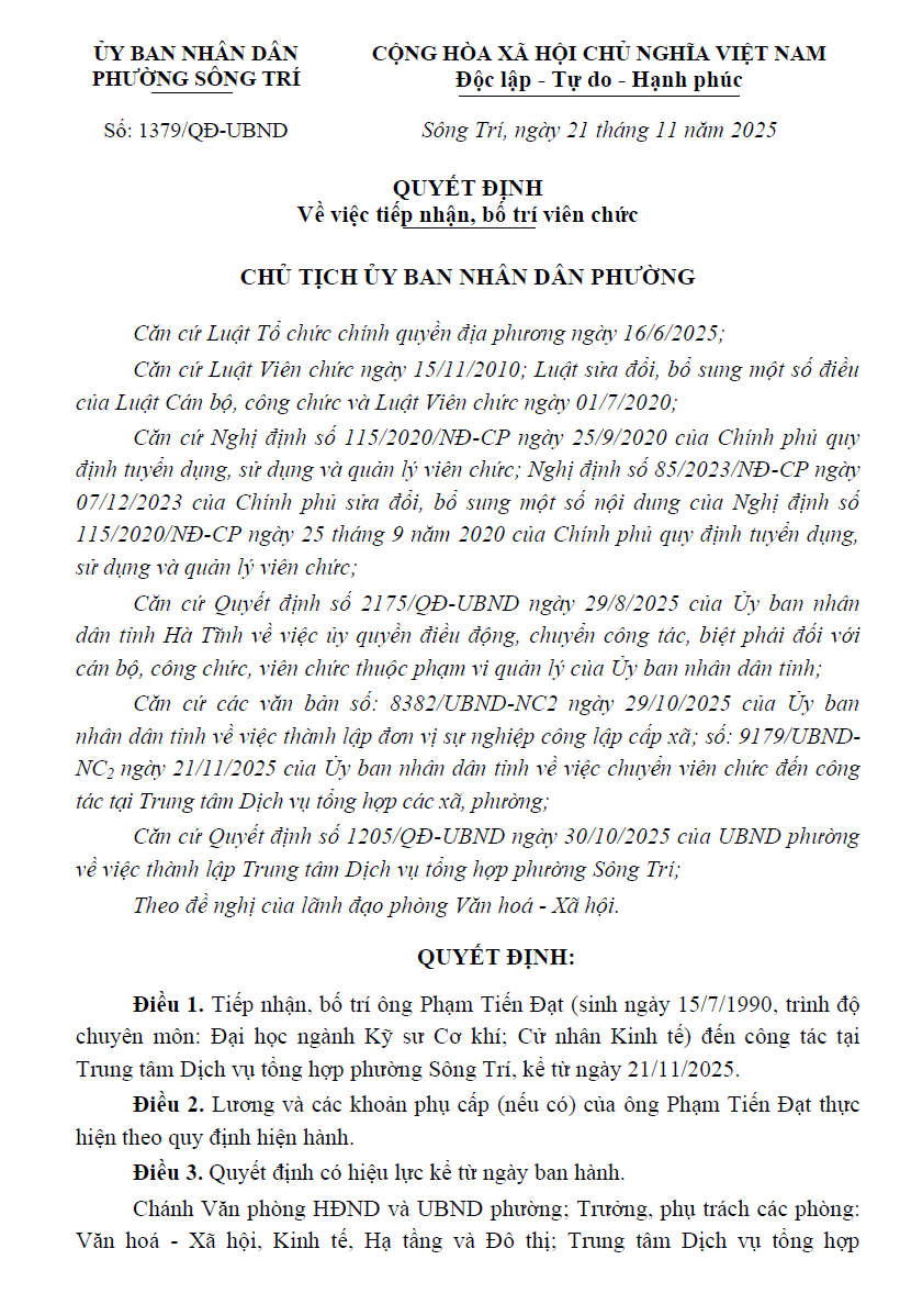 Quyết định về việc tiếp nhận, bố trí viên chức đến công tác tại Trung tâm Dịch vụ tổng hợp phường Sông TríẨn danh21/11/2025A -A+Ẩn danh21/11/2025A -A+
