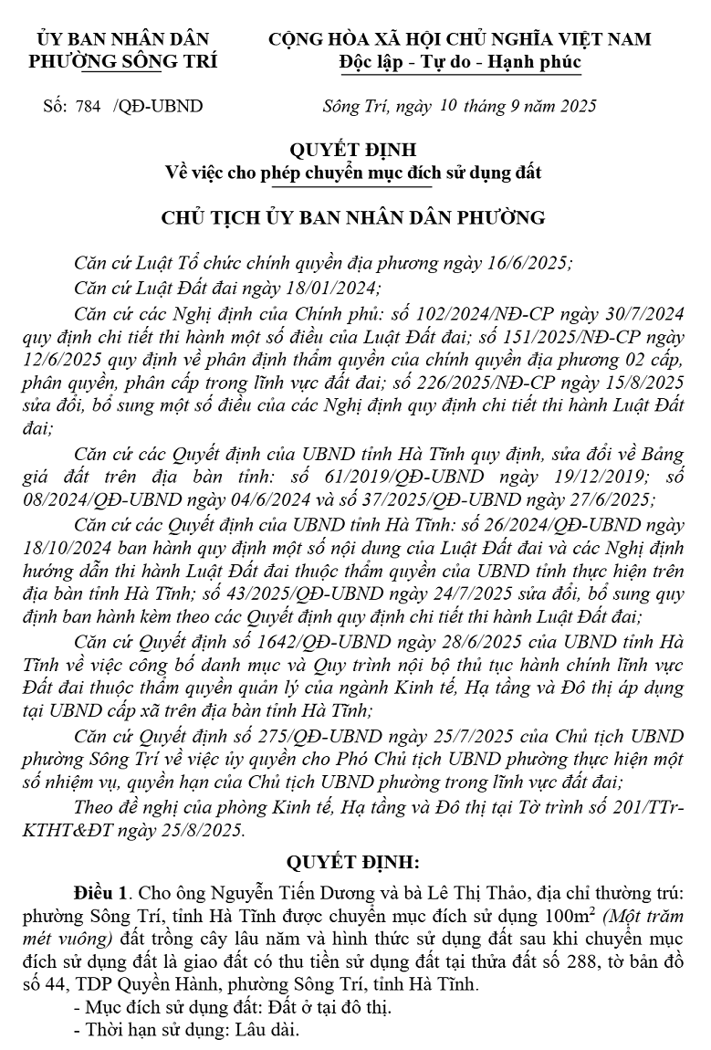 Quyết định v/v cho phép chuyển mục đích sử dụng đấtẨn danh10/09/2025A -A+Ẩn danh10/09/2025A -A+ File đính kèmQD 44.288-QD-Nguyen-Tien-Duong-Thao-_hieunhsongtri-10-09-2025_10h40p12(11.09.2025_07h42p11)_signed.pdf