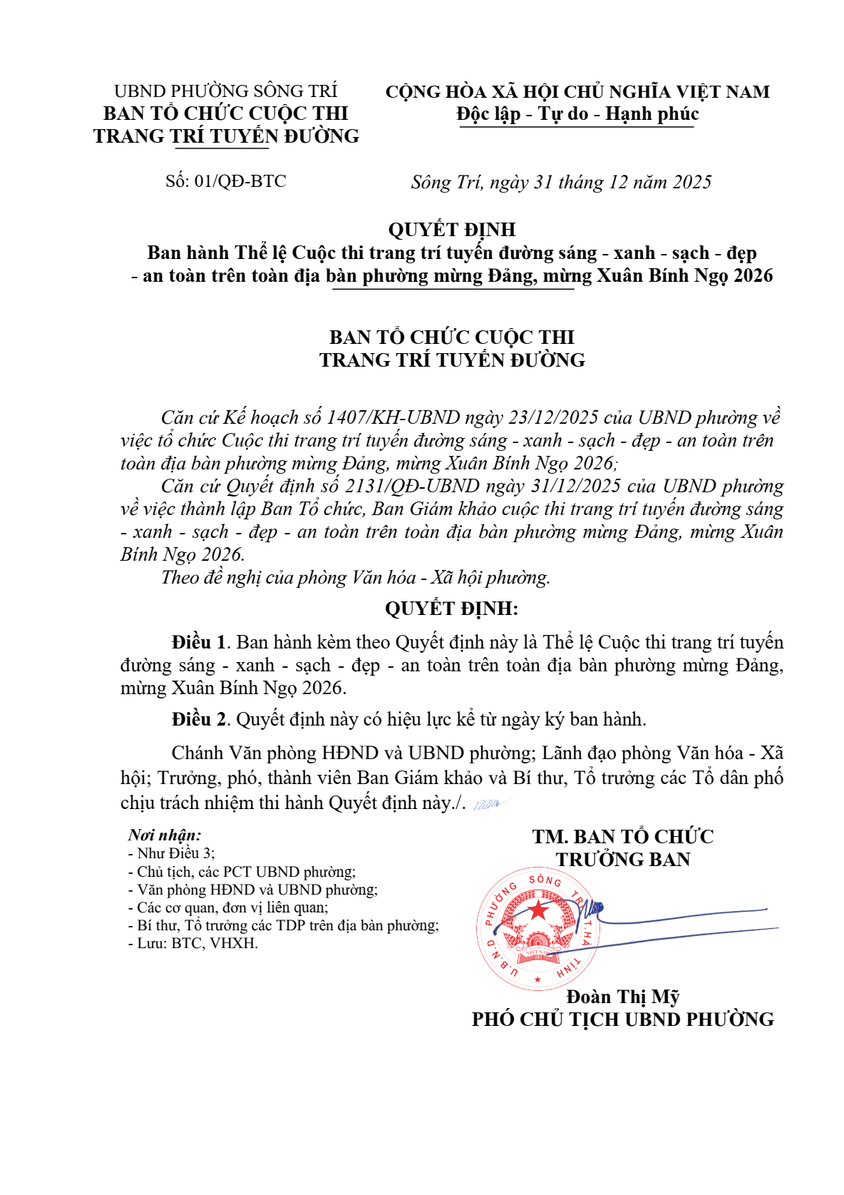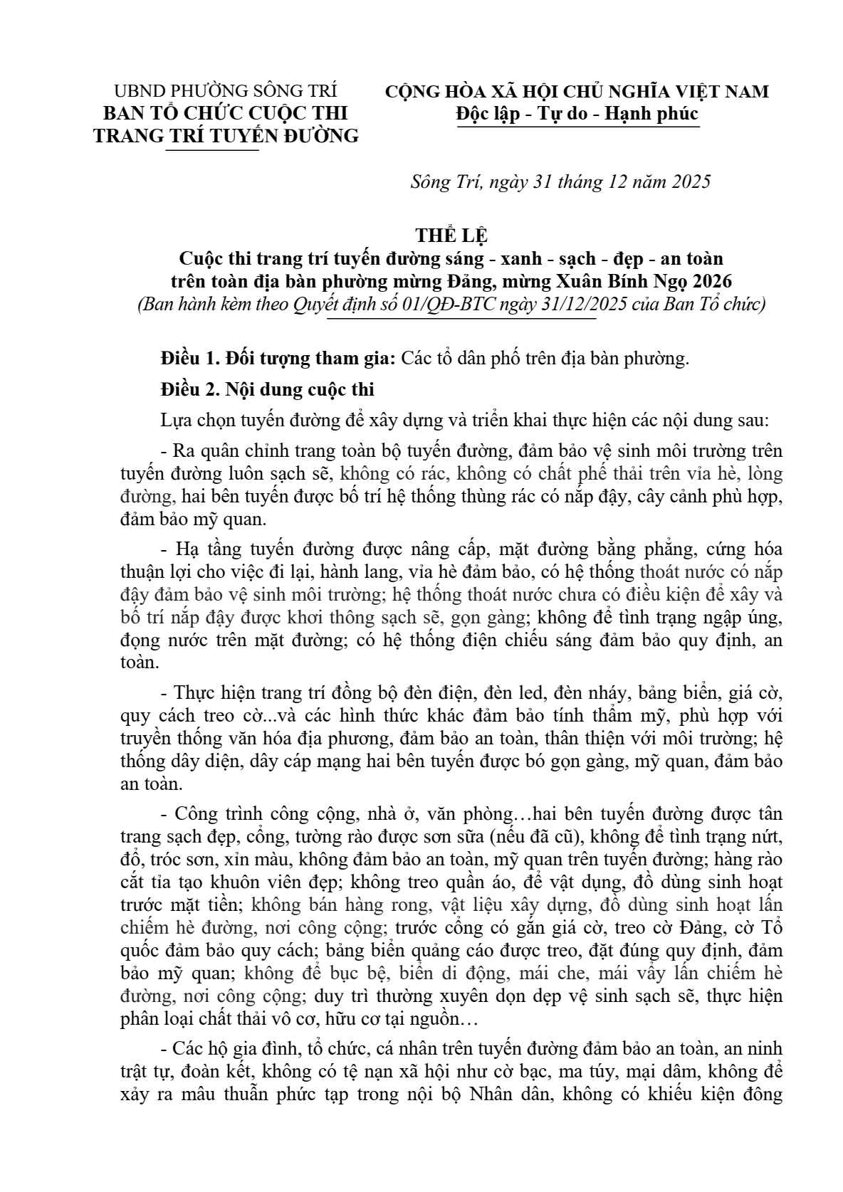 Thể lệ Cuộc thi trang trí tuyến đường sáng - xanh - sạch - đẹp - an toàn trên toàn địa bàn phường mừng Đảng, mừng Xuân Bính Ngọ 2026Ẩn danh14/01/2026A -A+Ẩn danh14/01/2026A -A+ File đính kèm2026.-QD-01-ve-ban-hanh-the-le-cuoc-thi-sang-xanh-sach-dep-an-toan)_signed.pdf