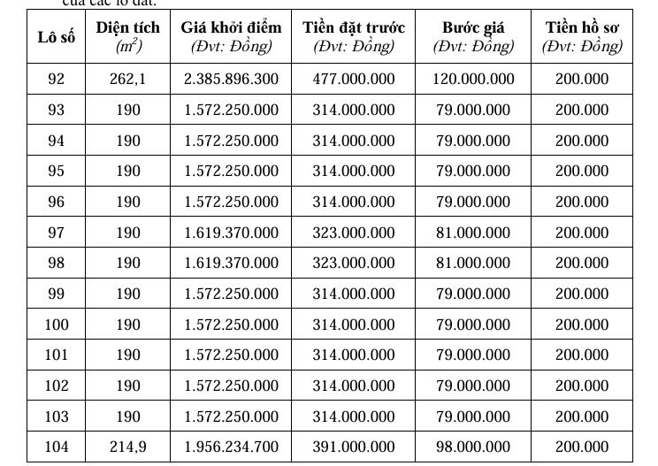 Ký hiệu, lô số, diện tích, giá khởi điểm, tiền đặt trước, bước giá, tiền hồ sơ