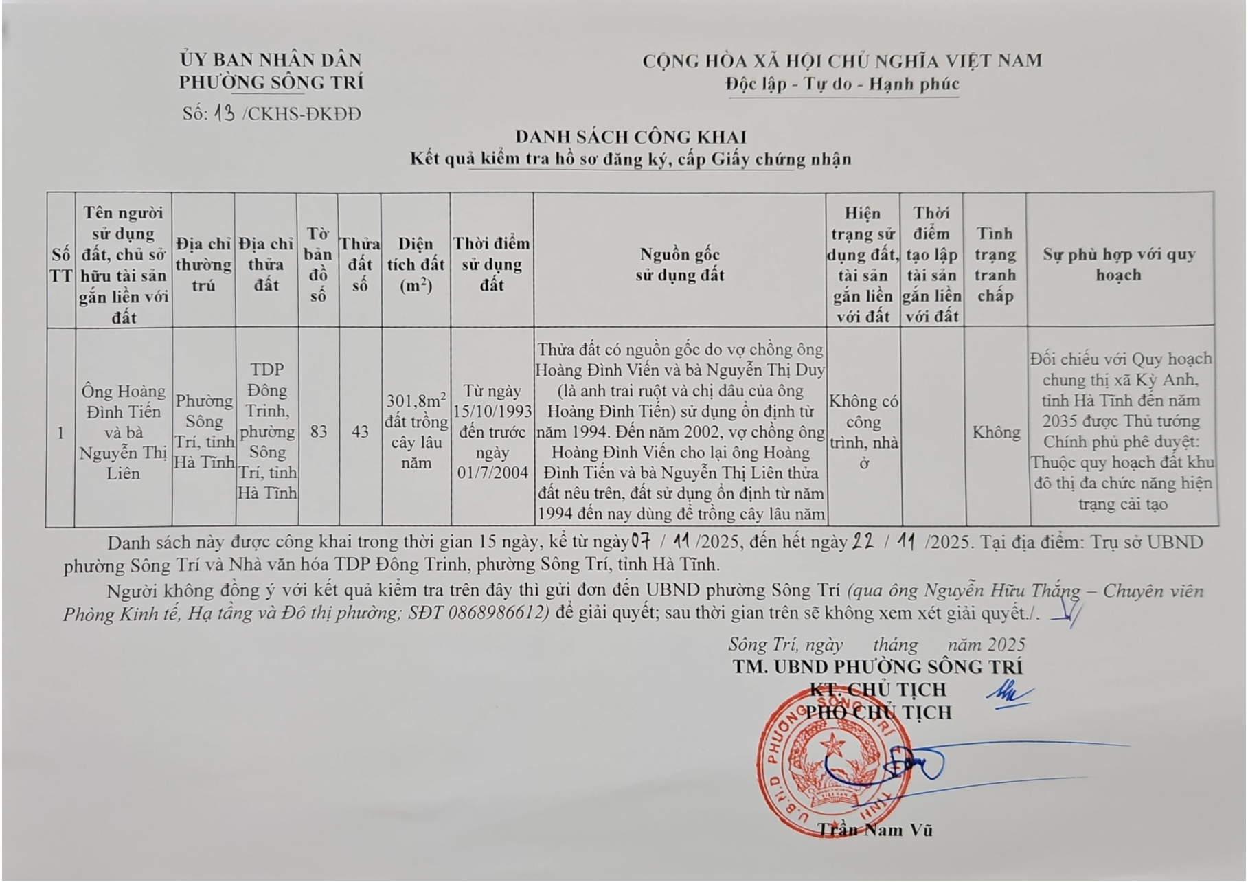 Thông báo kiểm tra hồ sơ đăng ký, Cấp giấy chứng nhận ông Hoàng Đình TiếnẨn danh10/11/2025A -A+Ẩn danh10/11/2025A -A+Thông báo kiểm tra hồ sơ đăng ký, Cấp giấy chứng nhận ông Hoàng Đình Tiến