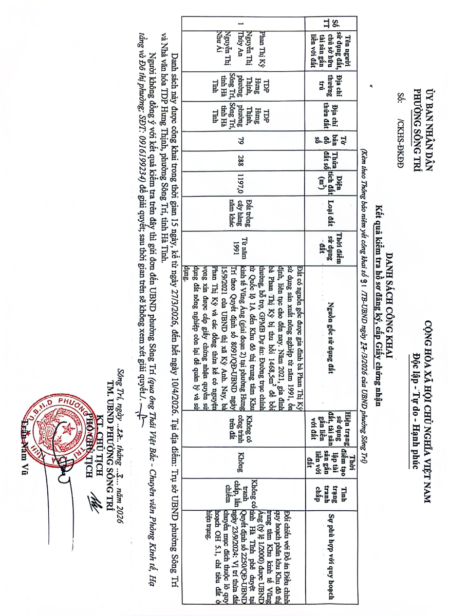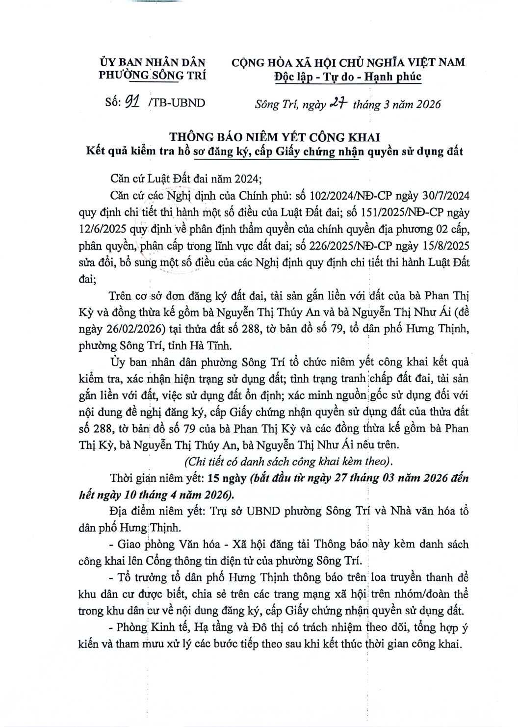Thông báo niêm yết công khai kết quả kiểm tra hồ sơ đăng ký, cấp Giấy chứng nhận quyền sử dụng đấtẨn danh27/03/2026A -A+Ẩn danh27/03/2026A -A+