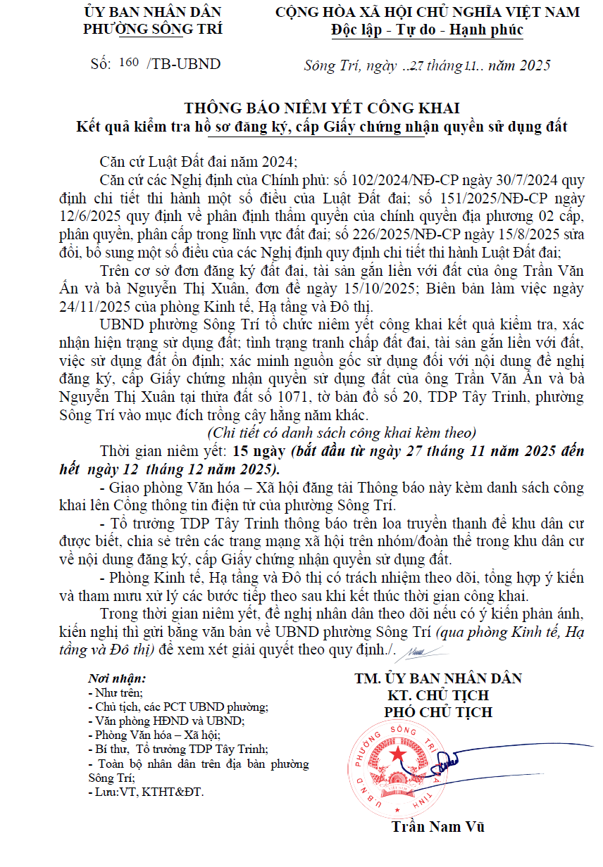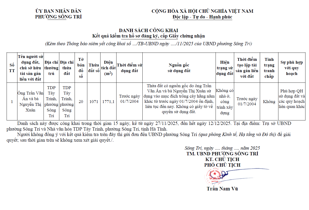 Thông báo niêm yết công khai kết quả kiểm tra hồ sơ đăng ký, cấp Giấy chứng nhận quyền sử dụng đấtẨn danh27/11/2025A -A+Ẩn danh27/11/2025A -A+
