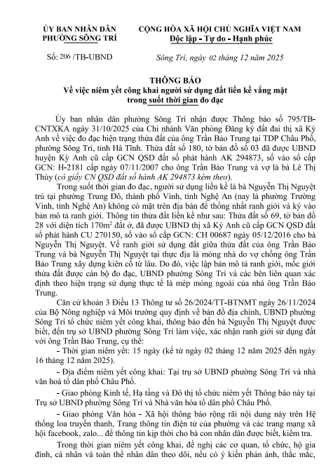 Thông báo niêm yết công khai người sử dụng đất liền kề vắng mặt trong suốt thời gian đo đạcẨn danh04/12/2025A -A+Ẩn danh04/12/2025A -A+ File đính kèmTB hộ liền kề vắng mặt trong suốt thời gian đo đạc ông Trần Bảo Trung.pdf