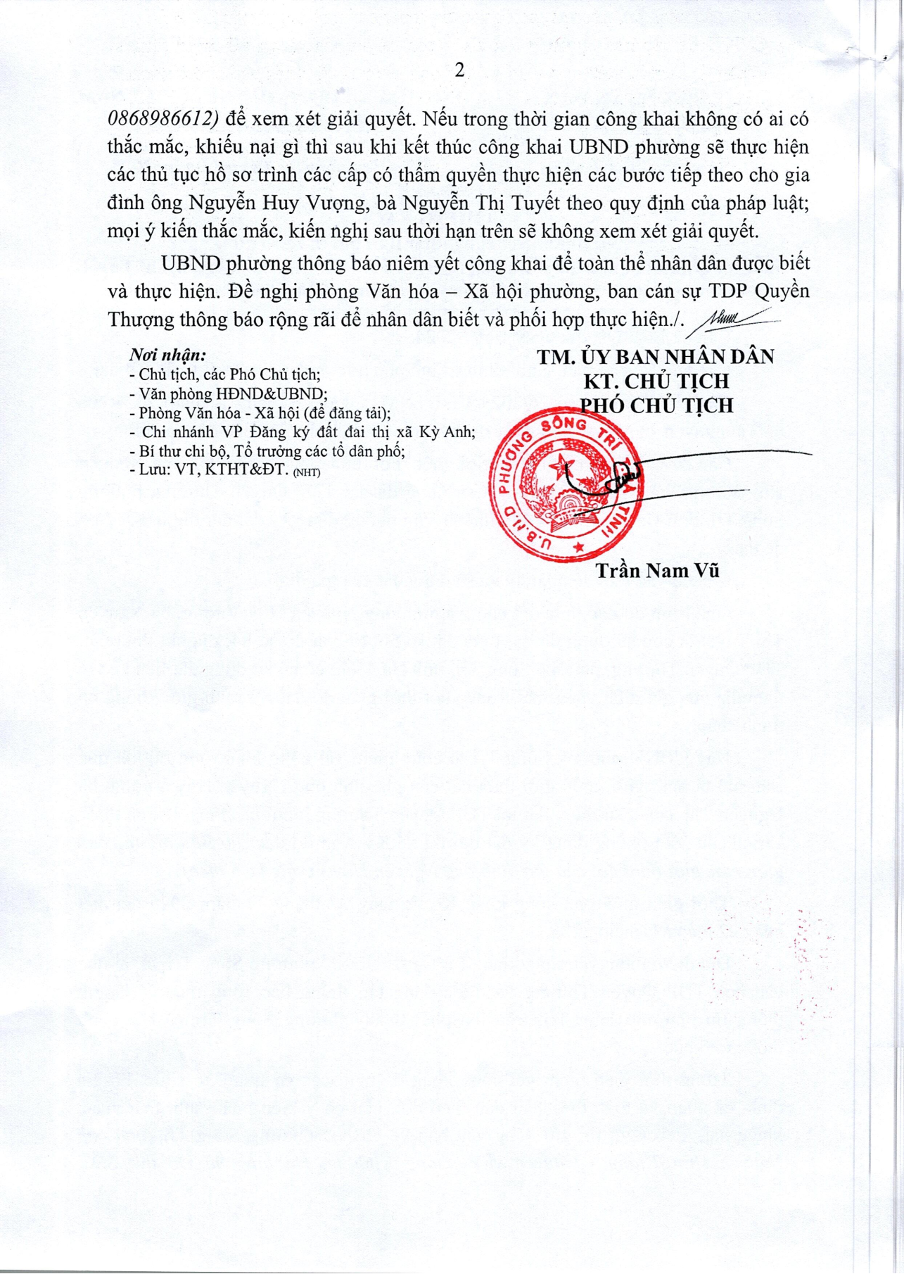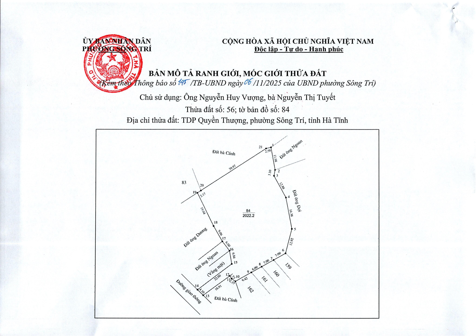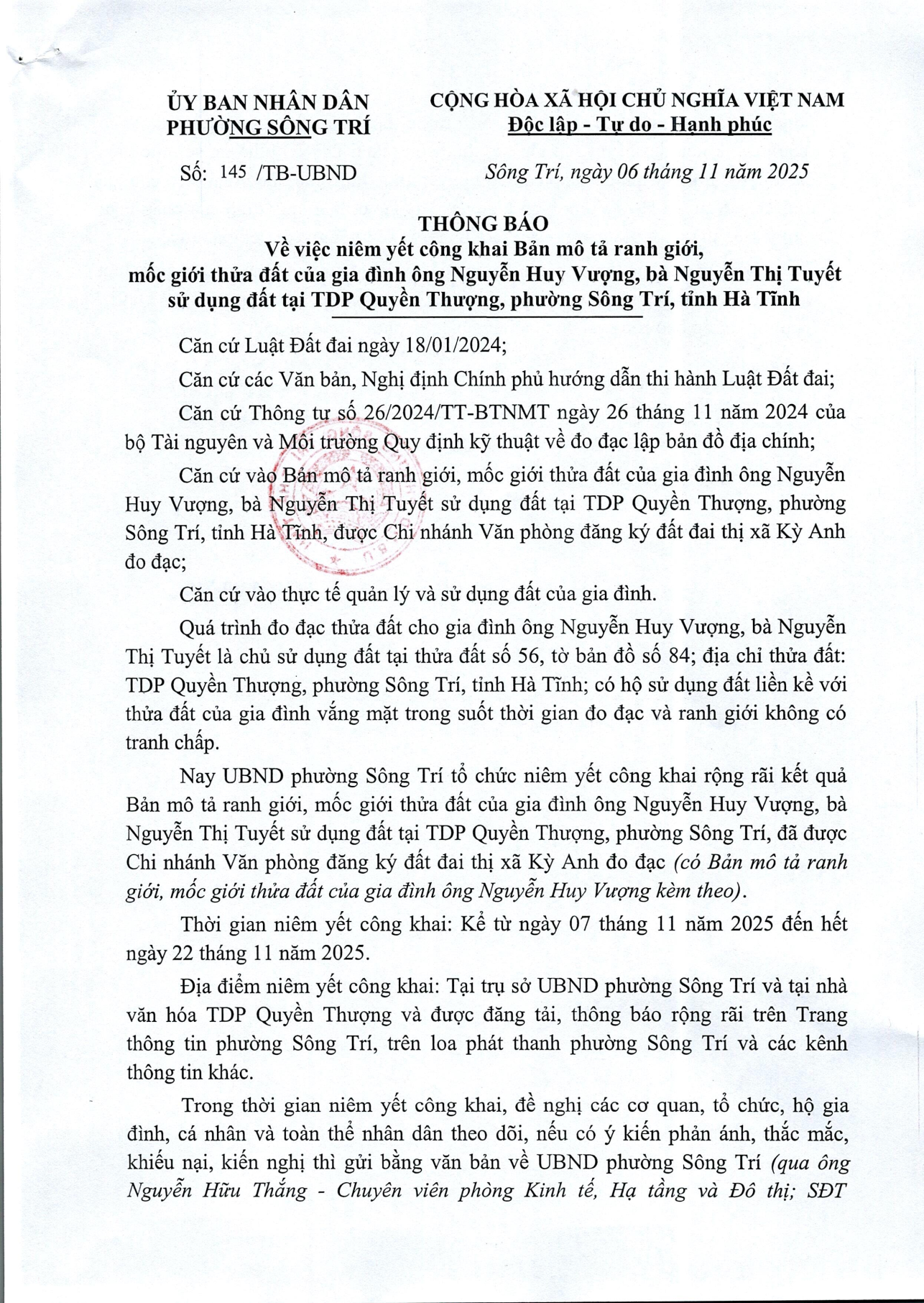 Thông báo về việc niêm yết công khai Bản mô tả ranh giới, mốc giới thửa đất của gia đình ông Nguyễn Huy Vượng, bà Nguyễn Thị Tuyết sử dụng đất tại TDP Quyền Thượng, phường Sông Trí, tỉnh Hà Tĩnh