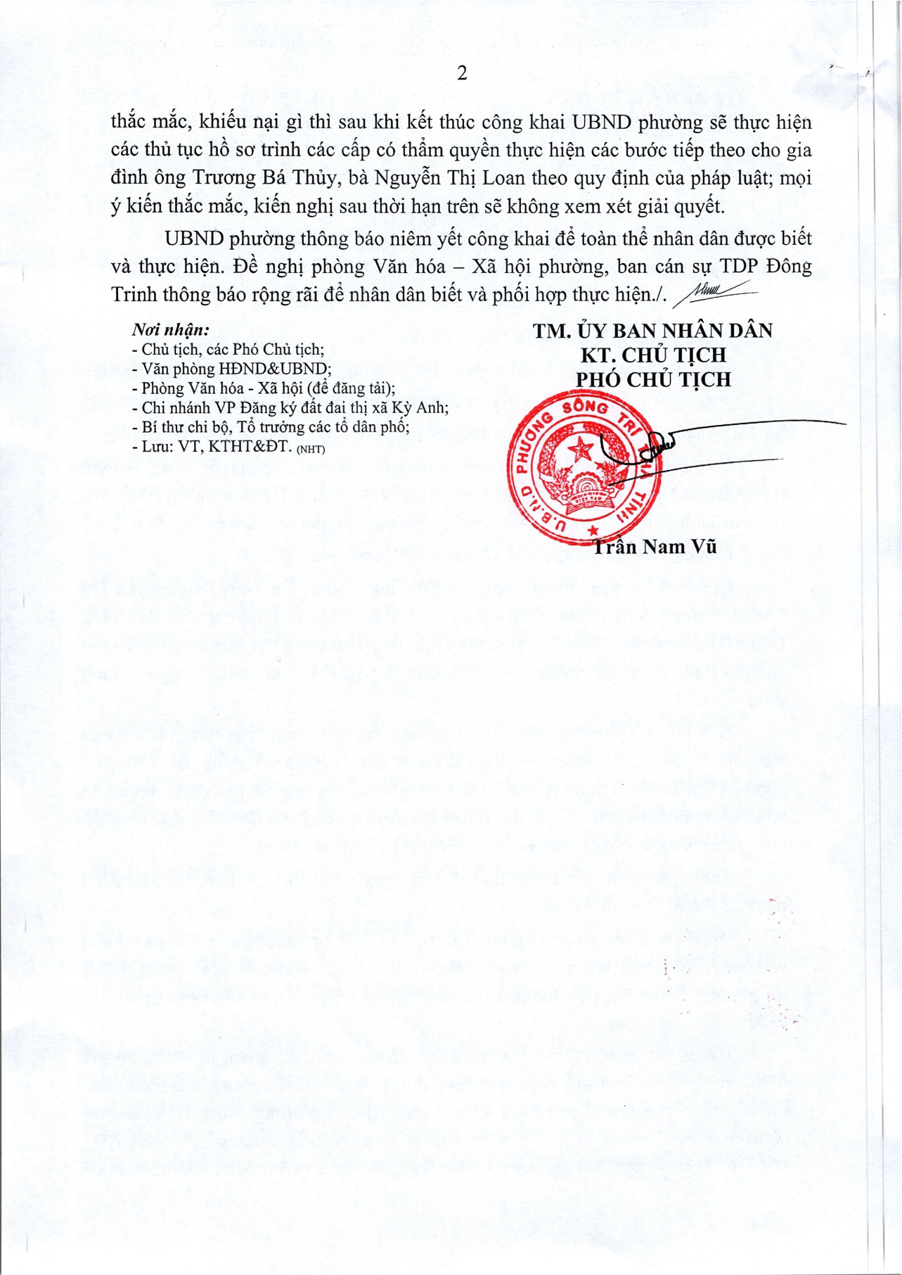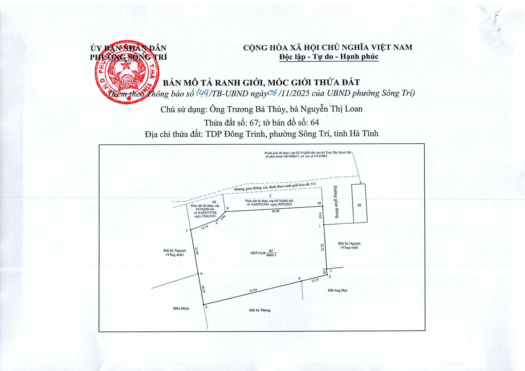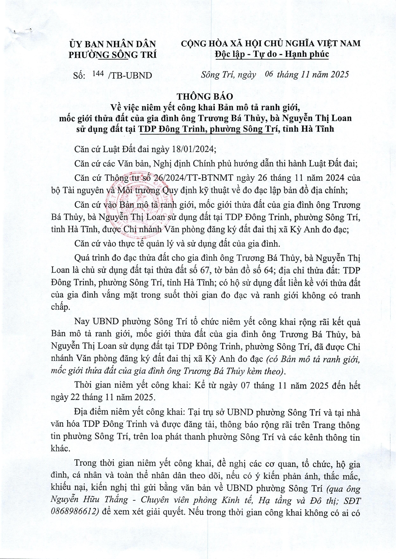 Thông báo về việc niêm yết công khai Bản mô tả ranh giới, mốc giới thửa đất của gia đình ông Trương Bá Thủy, bà Nguyễn Thị Loan sử dụng đất tại TDP Đông Trinh, phường Sông Trí, tỉnh Hà Tĩnh