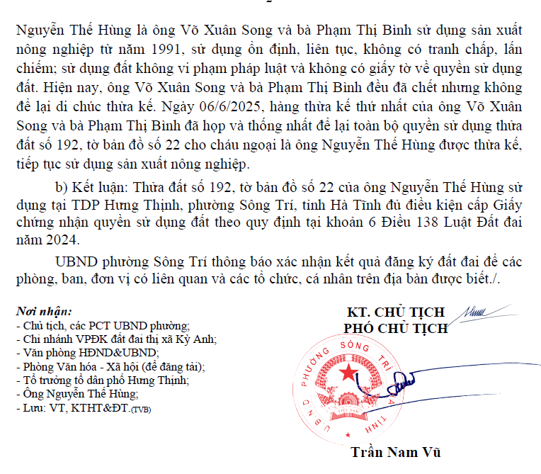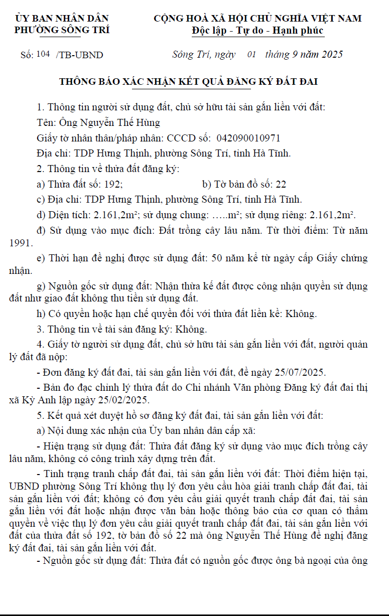 Thông báo xác nhận kết quả đăng ký đất đaiẨn danh02/10/2025A -A+Ẩn danh02/10/2025A -A+ File đính kèmTB-xac-nhan-ket-qua-dang-ky-dat-dai-doi-voi-ong-Nguyen-The-Hung_hieunhsongtri-30-09-2025_21h30p09(01.10.2025_15h11p51)_signed.pdf