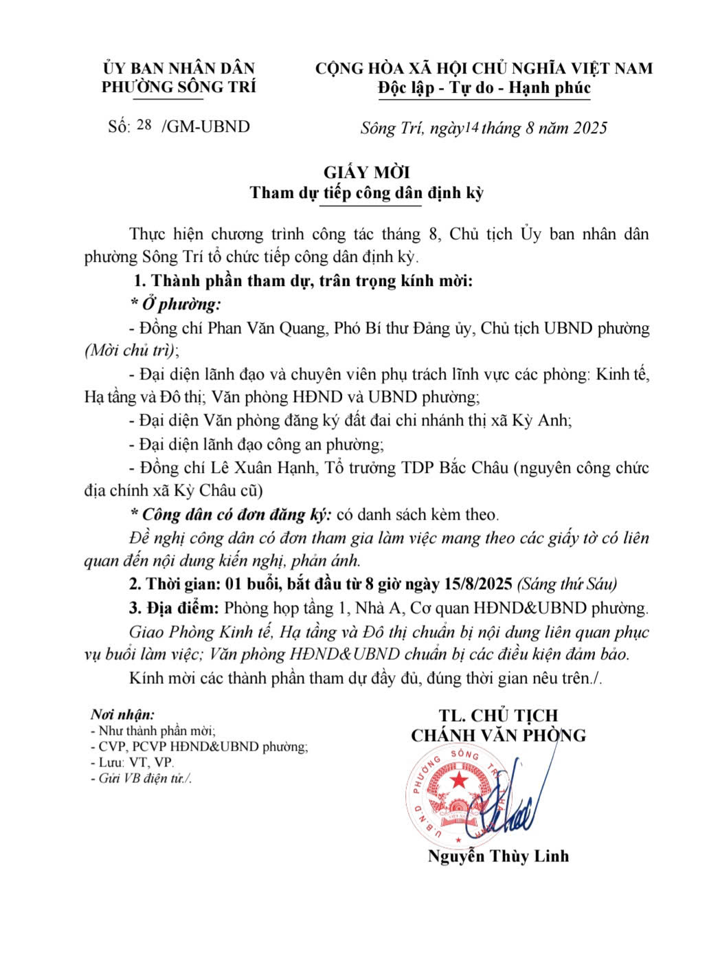 Tin liên quanPhường Sông Trí phát động hưởng ứng cuộc thi trực tuyến tìm hiểu Nghị quyết 57 - NQ/TW của Bộ Chính trị về đột phá phát triển khoa học, công nghệ, đổi mới sáng tạo và chuyển đổi số quốc giaPhường Sông Trí tổ chức gặp mặt Kỷ niệm 21 năm Ngày Doanh nhân Việt Nam (13/10/2004-13/10/2025)Chủ động phòng bệnh tả - Bảo vệ sức khỏe cộng đồngĐảng ủy phường Sông Trí tổ chức Hội nghị Báo cáo viên tháng 10 năm 2025Phường Sông Trí tham dự Hội nghị trực tuyến về tình hình kinh tế - xã hội 9 tháng năm 2025