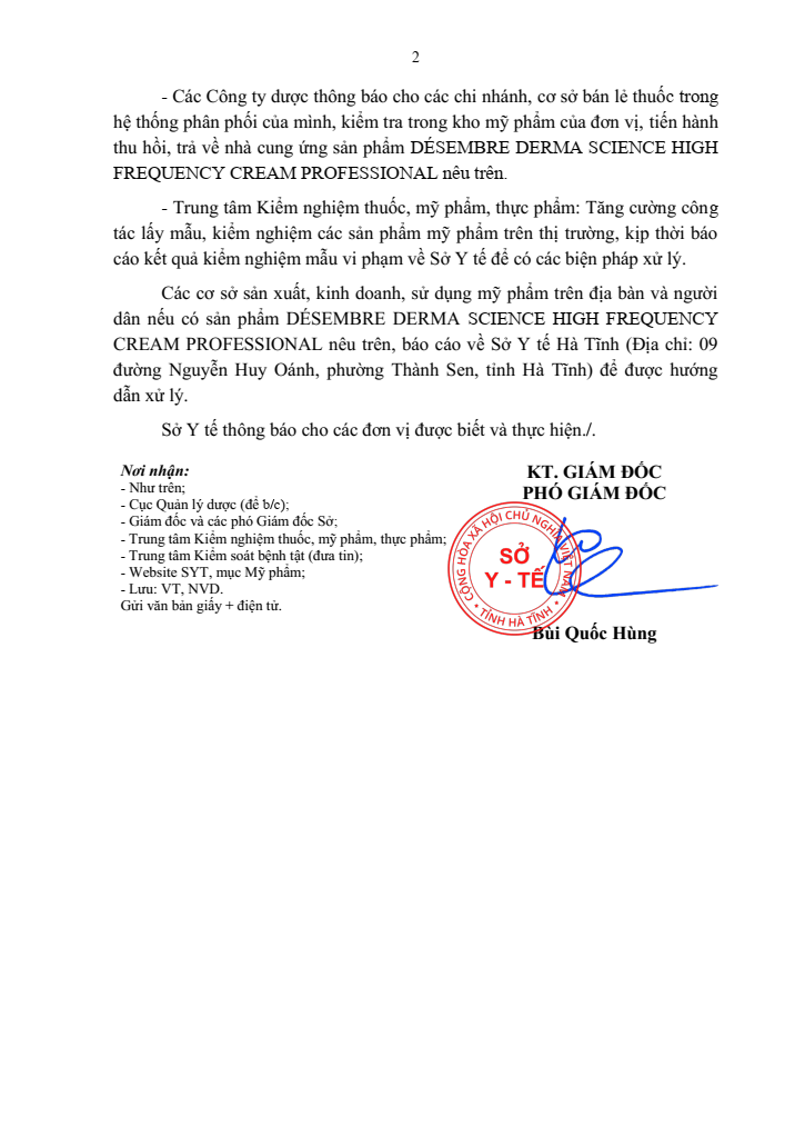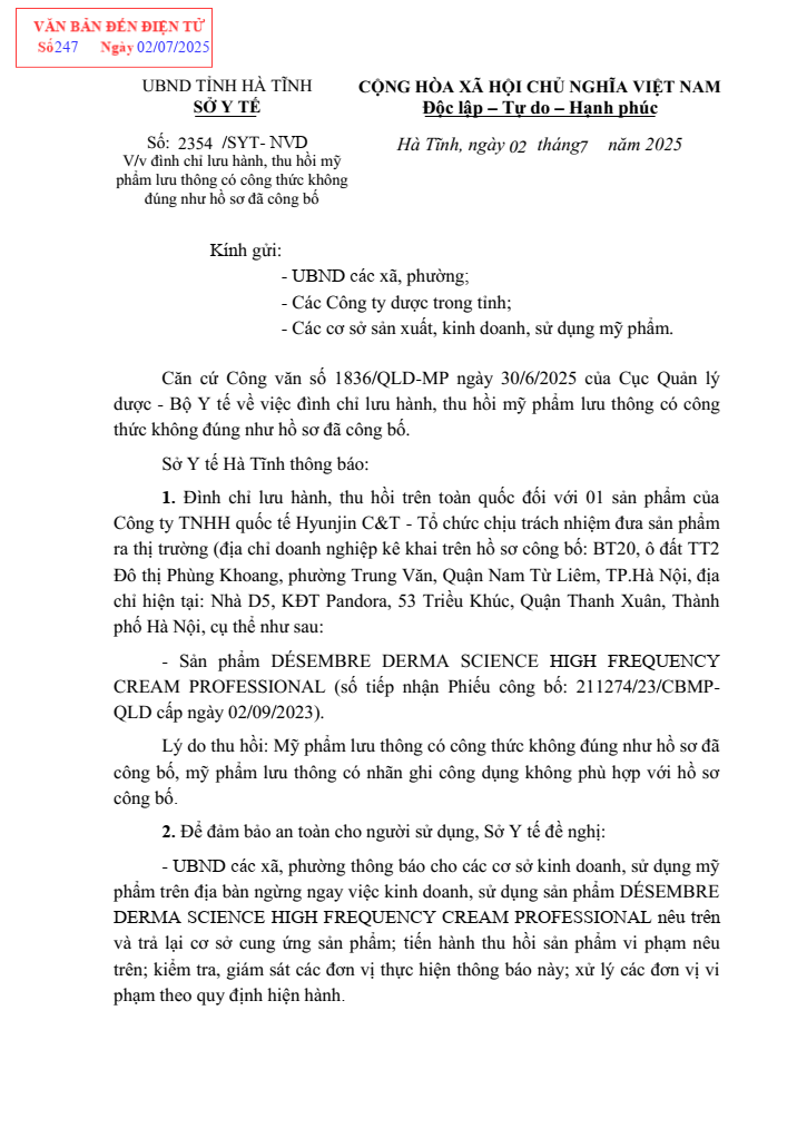 Văn bản 2354/SYT-NVD V/v đình chỉ lưu hành, thu hồi mỹ phẩm lưu thông có công thức không đúng như hồ sơ đã công bốẨn danh16/07/2025A -A+Ẩn danh16/07/2025A -A+ File đính kèmCong-ty-TNHH-quoc-te-Hyunjin.pdf