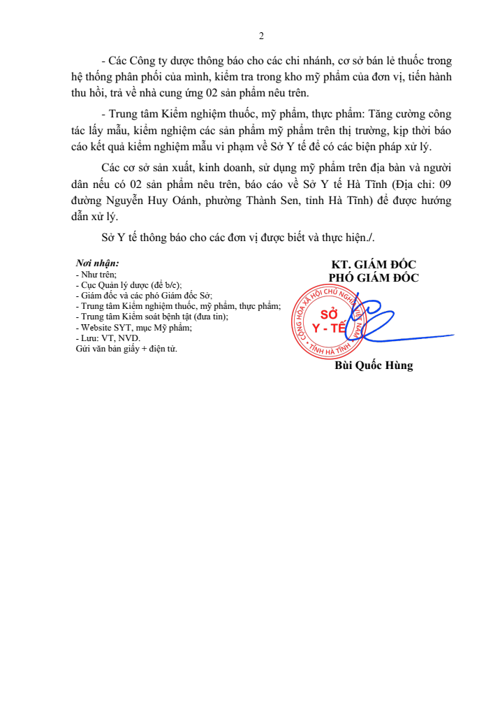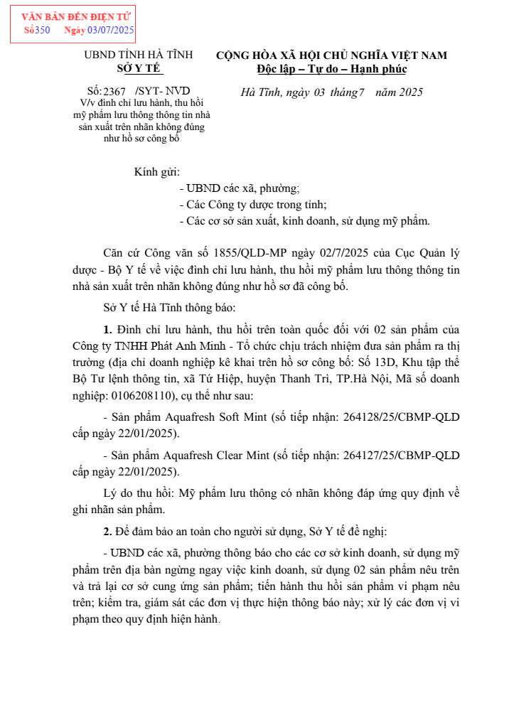 Văn bản 2367/SYT-NVD V/v đình chỉ lưu hành, thu hồi mỹ phẩm lưu thông thông tin nhà sản xuất trên nhãn không đúng như hồ sơ công bốẨn danh18/07/2025A -A+Ẩn danh18/07/2025A -A+ File đính kèmCong-ty-Phat-Anh-Minh.pdf