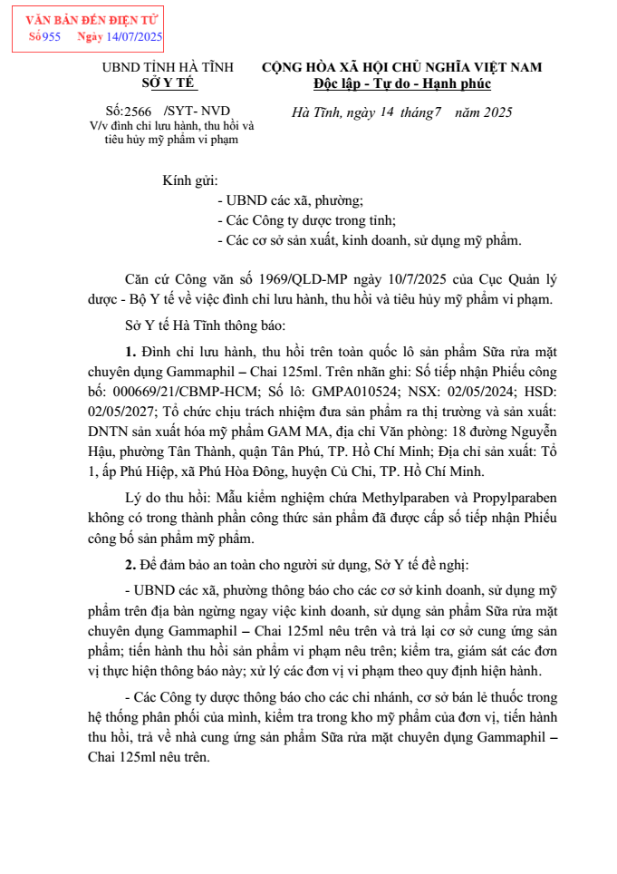VB2566 - V/v đình chỉ lưu hành, thu hồi và tiêu hủy mỹ phẩm vi phạmẨn danh17/07/2025A -A+Ẩn danh17/07/2025A -A+ File đính kèmDinh-chi-luu-hanh-thu-hoi-va-tieu-huy-m-pham-vi-pham-Gammaphil.pdf