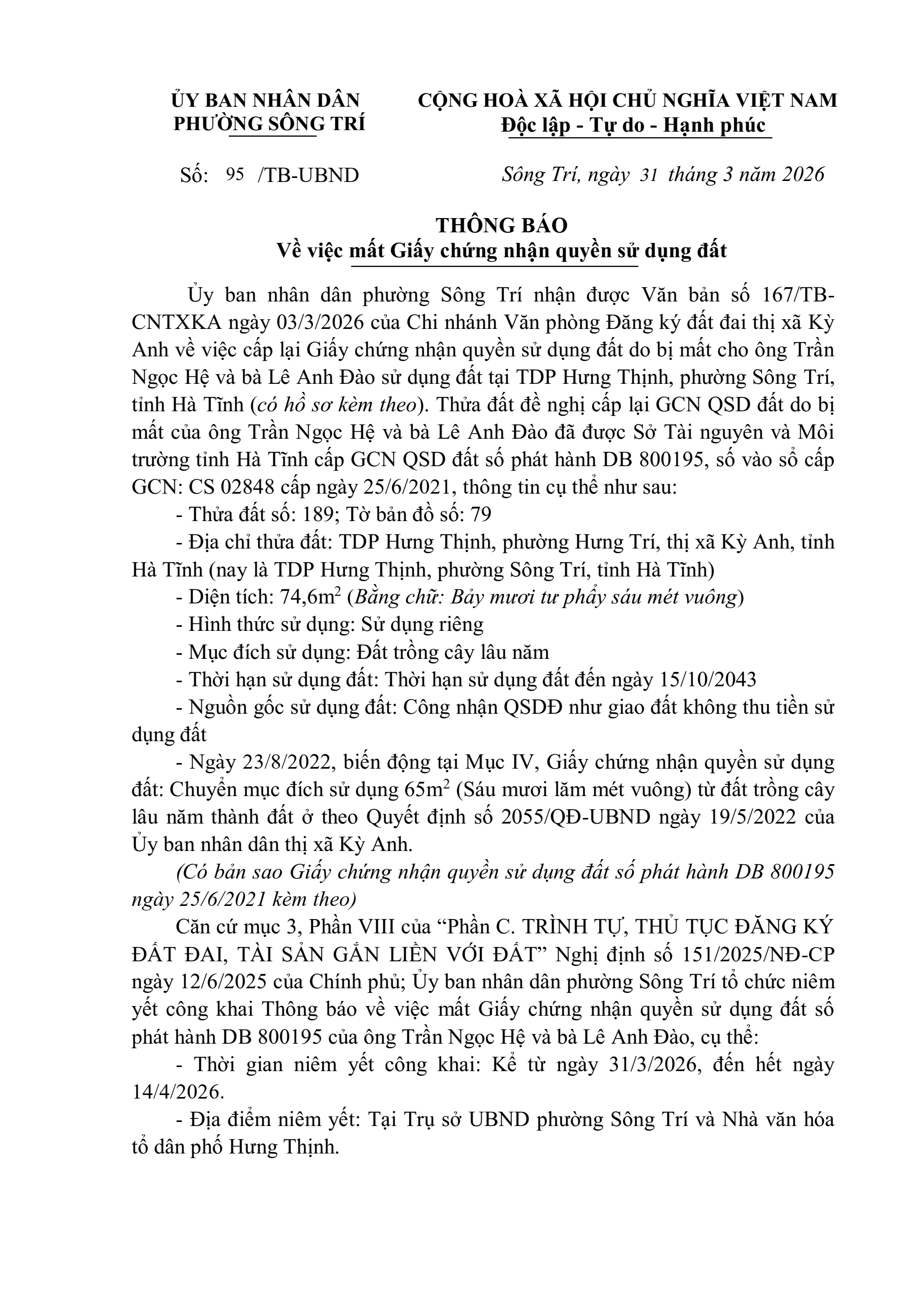 Ủy ban nhân dân phường Sông Trí nhận được Văn bản số 167/TBCNTXKA ngày 03/3/2026 của Chi nhánh Văn phòng Đăng ký đất đai thị xã Kỳ